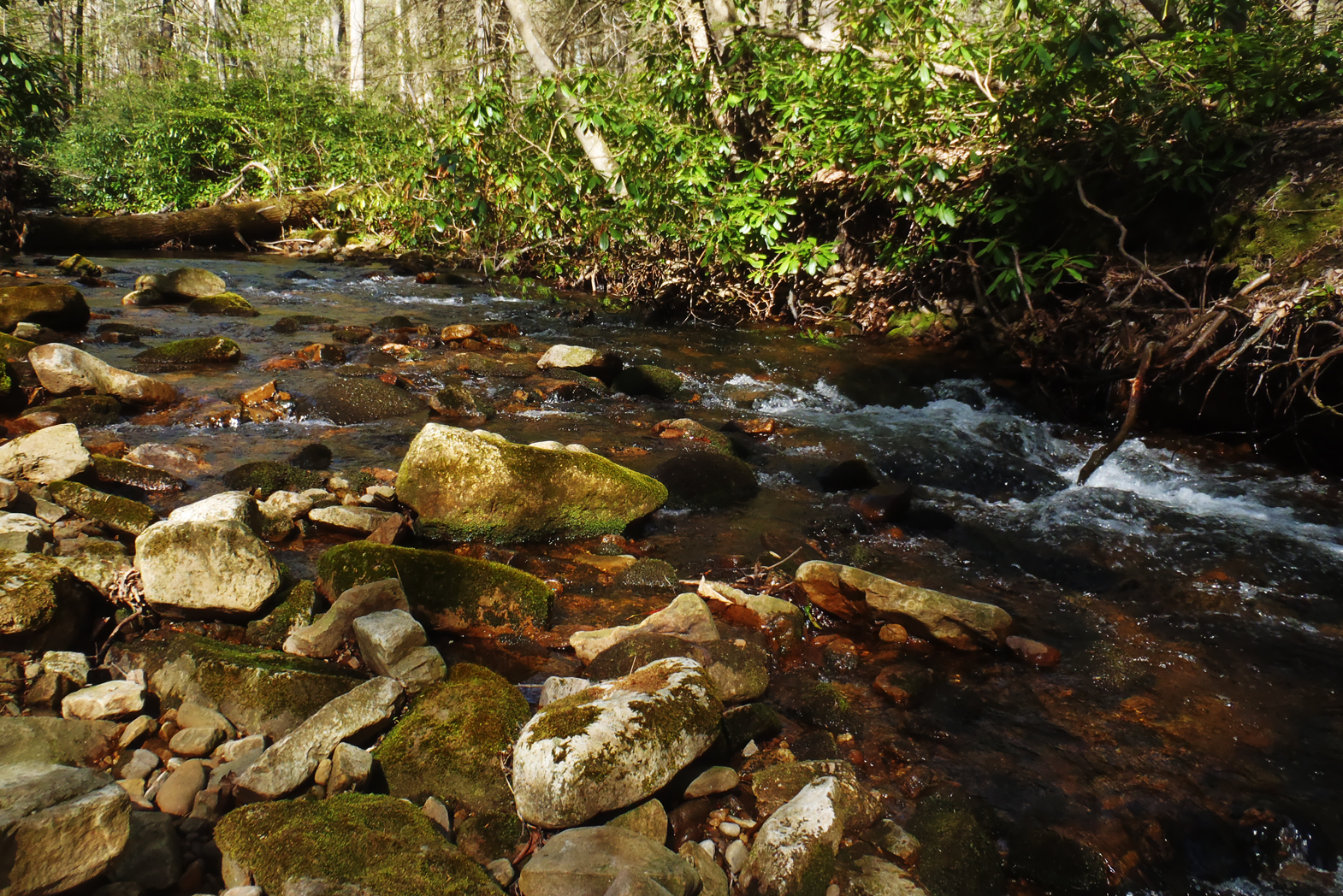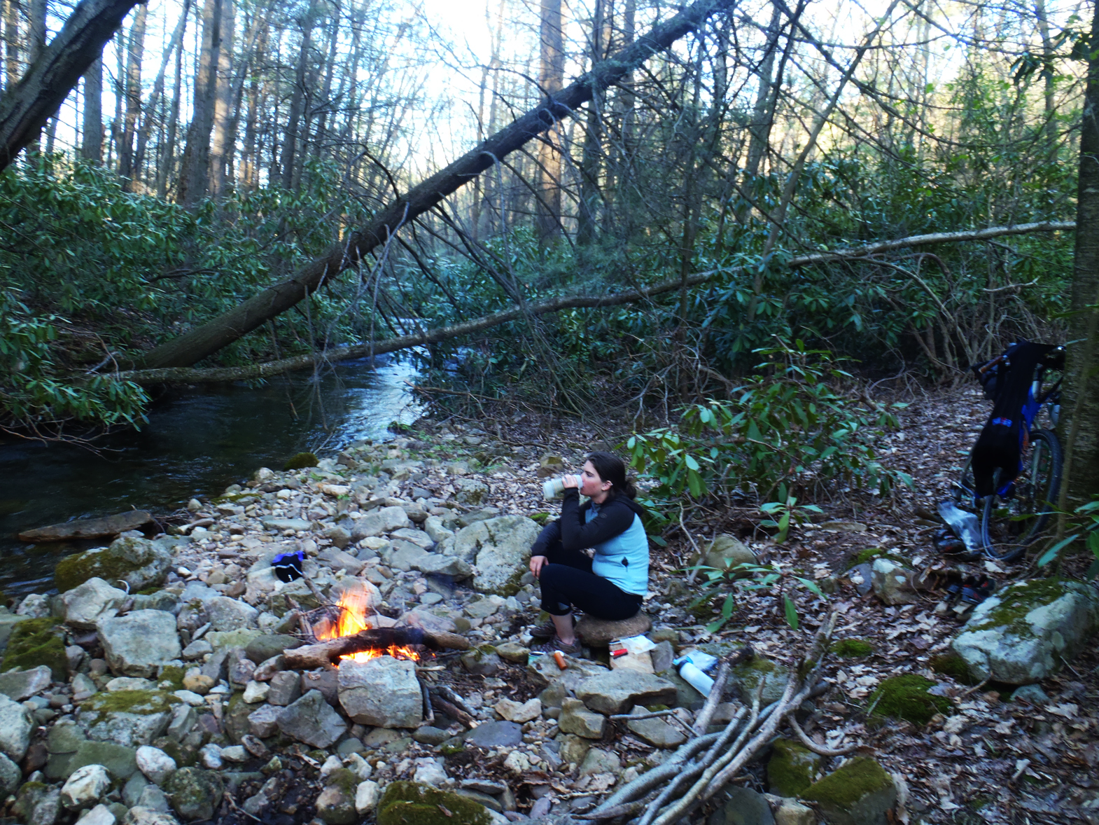 By the time we got to Mifflinburg, the miles seemed longer. I was hot, sweating profusely in my long sleeves and lack of shade on the open road. I felt a little lightheaded in the heat, and I struggled to maintain my good mood. The cool air inside the store, the promise of a good dinner, and the realization that we didn’t have that far to go until we could find a spot to camp perked me up a bit. But I was tired, no doubt about it. Bags loaded with food made the bike feel noticeably heavier—or maybe it was all in my head. I slowly pedaled up and over little hill after little hill, baking in the late afternoon sun. I felt sluggish, frustration building. The winding asphalt turned to gravel, and I mentally hit a wall. Suddenly all I could think was I can’t do this anymore. I was exhausted and hungry and everything hurt. I did something I very rarely do—I vocalized my struggle and told Evan that I needed a few minutes to take a break. I tried to get my head back in the game, and got it together enough to make it to the state forest. Less than a mile later, we quickly found a perfect spot to camp, in a grove of rhododendrons, beside a clear stream, and for a few minutes, I felt pretty sheepish about wanting to give up when we were so close.