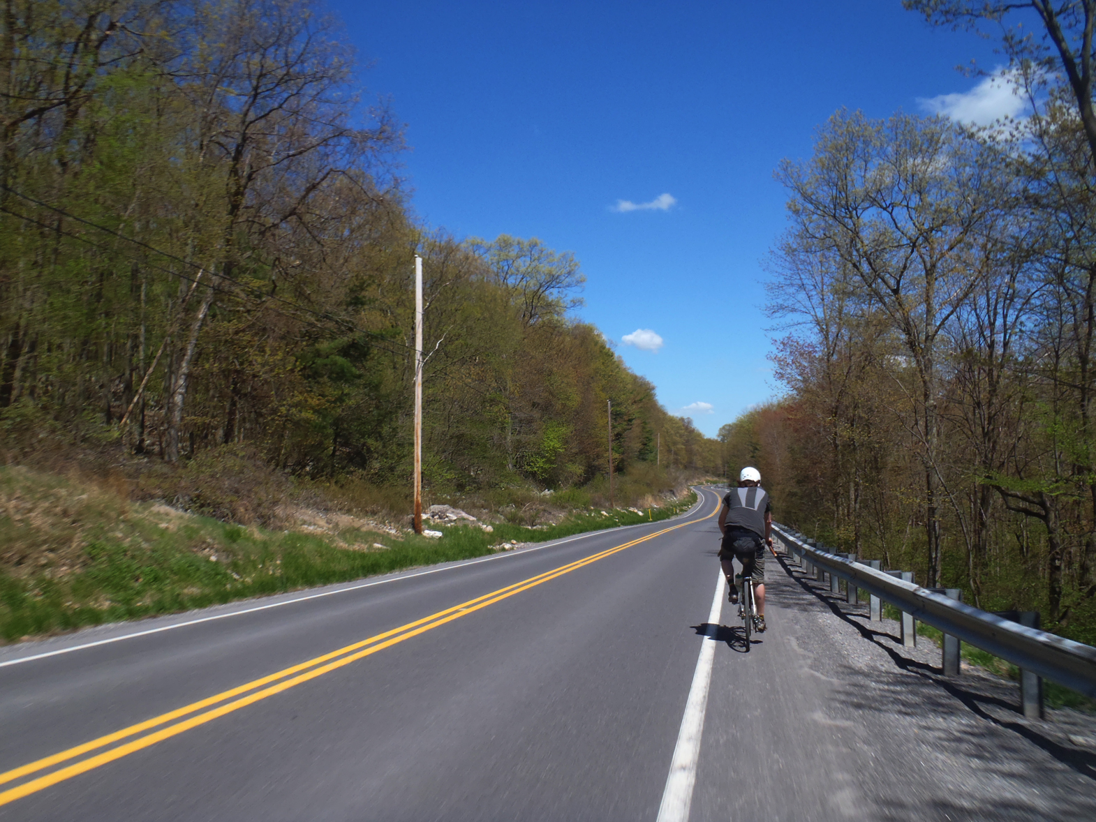 Climbing up the mountain through Woodward Gap, we passed several other cyclists going in the opposite direction, also enjoying the beautiful spring day. The long climb was rewarded with an equally long downhill, coasting for several miles with forest on both sides, the cool breeze on my face and in my hair. Life was good.