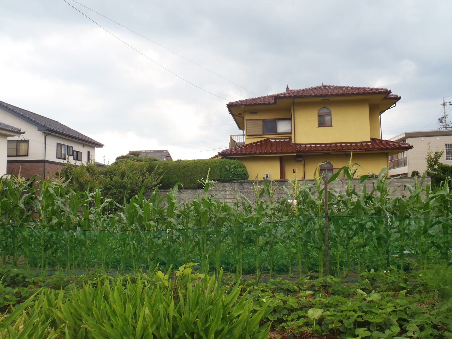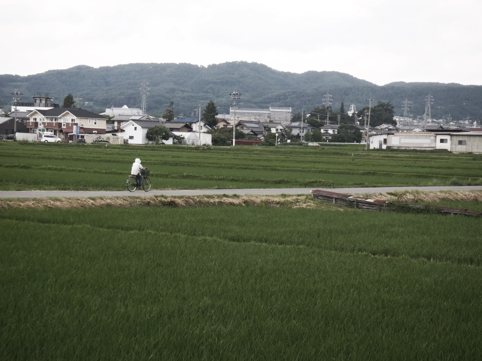 Dead-ends force me to turn around, retracing my steps to try another route. I come across a temple, standing amidst houses and a laundromat and several small shops, surrounded by a wall of flowers of every color. The road leads me to a bike path, which I follow for a while, into fields of rice, towards a more unkempt and rustic-looking section of town. Laundry hangs on porches of small houses. I see several men working out in their gardens, cutting the grass, trimming the flowers, making sure it’s all just so.