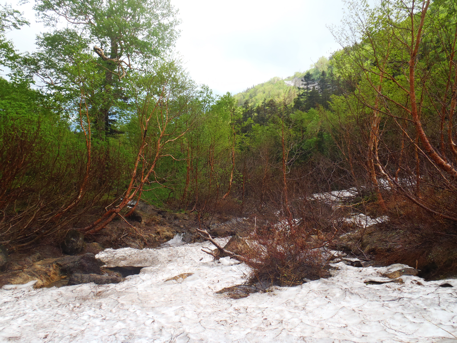 The cabin (and shoe) situation settled, we donned rain gear and headed out into the wet world, a world that at 2400 meters, was very different than hot, humid Matsumoto. Up here, it’s chilly. There is still plenty of snow, but amongst the snowy patches, there are also bright green shoots and stems and plants emerging from the ground. Flowers are beginning to bloom. Mountain streams are rushing, running high from a combination of snowmelt and the seemingly-continuous rain.