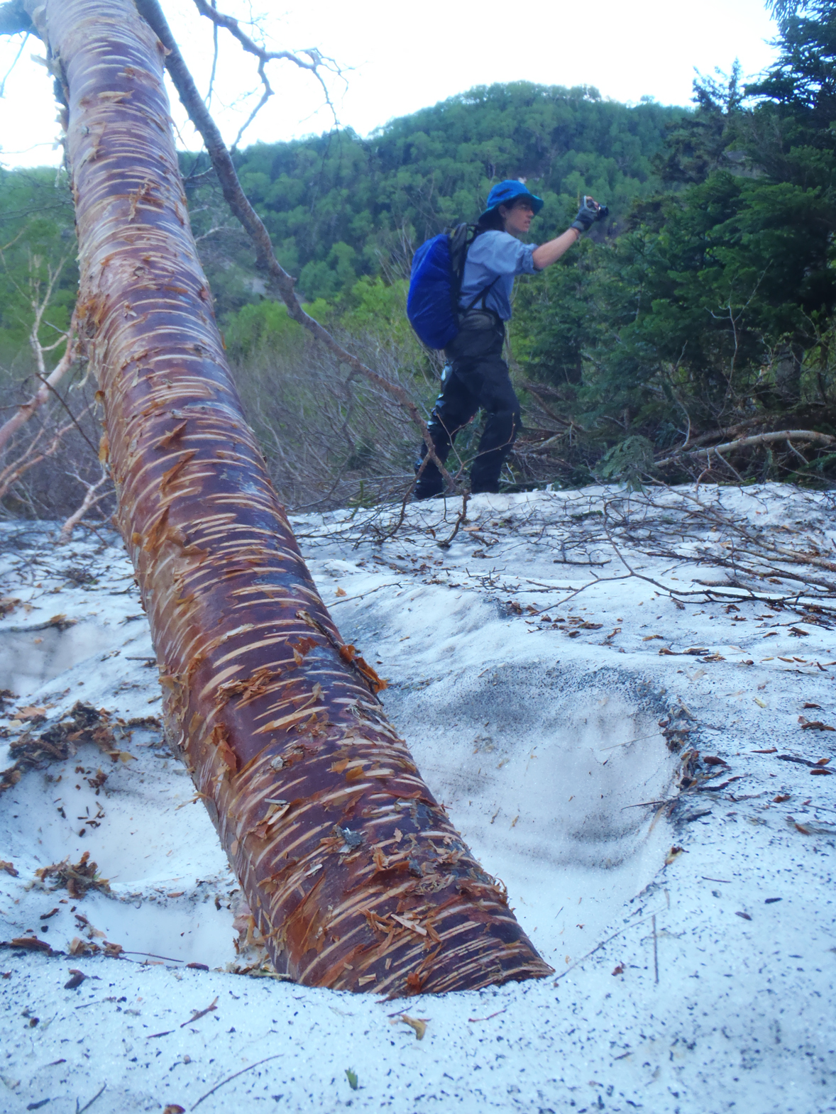 I am pulled out of my awe by the need to begin work, and we spend several hours and the remaining daylight coring trees, taking measurements, and crawling through the underbrush before deciding to call it quits and head back down towards the cabin. On our way, we come across a snowy slope, free of rocks and other obstacles. Amanda looks at me, plops down on the snow in her slippery rain pants, and proceeds to slide all the way down. I quickly followed suit, whooping and laughing, gaining speed as bumps in the snow nearly throw me into the air. My feet kick bits of snow into my face as I jam them into the snow to stop myself from flying into the stream below. I stand up, still giggling, suddenly infinitely less tired from the long day.