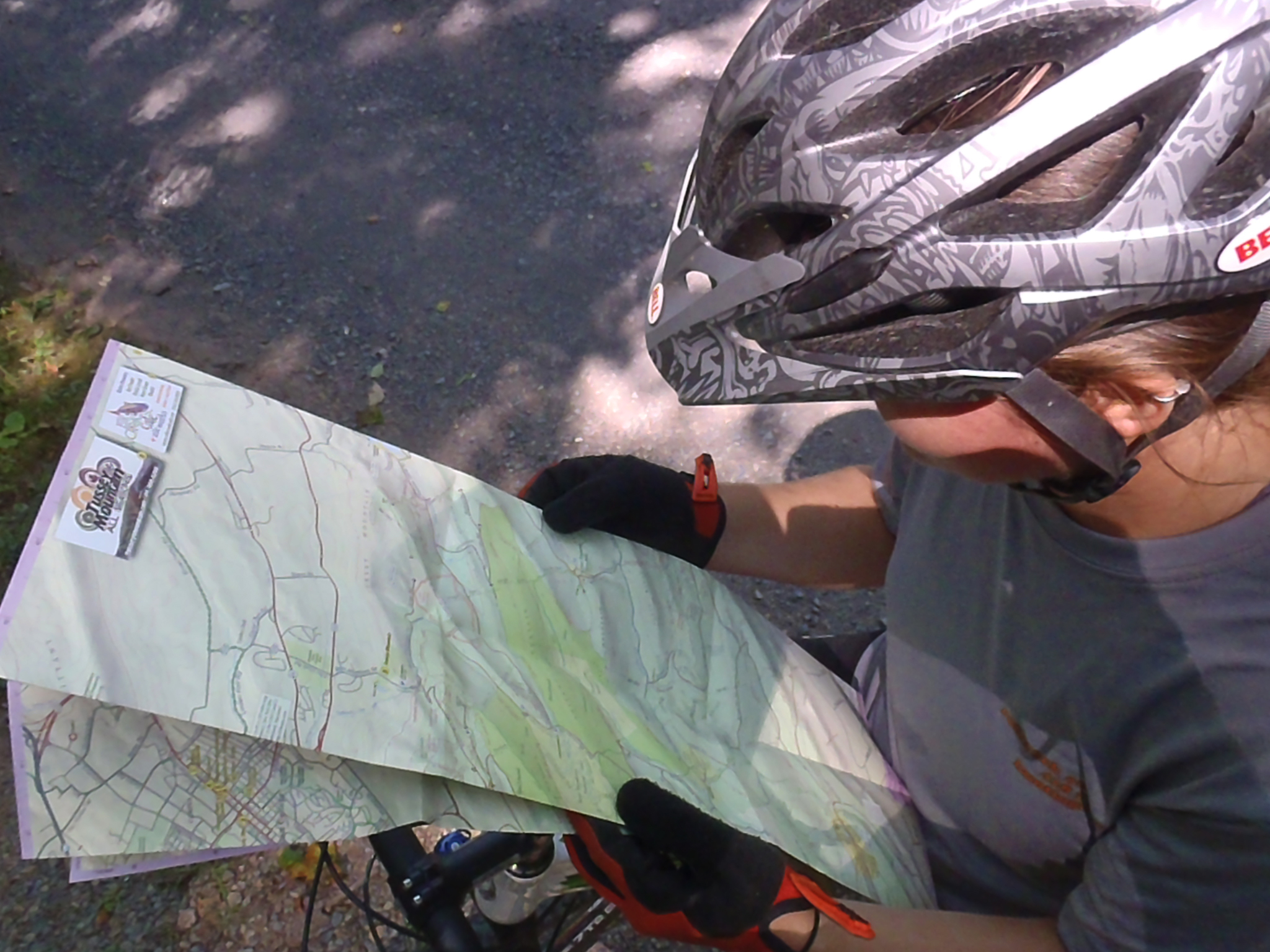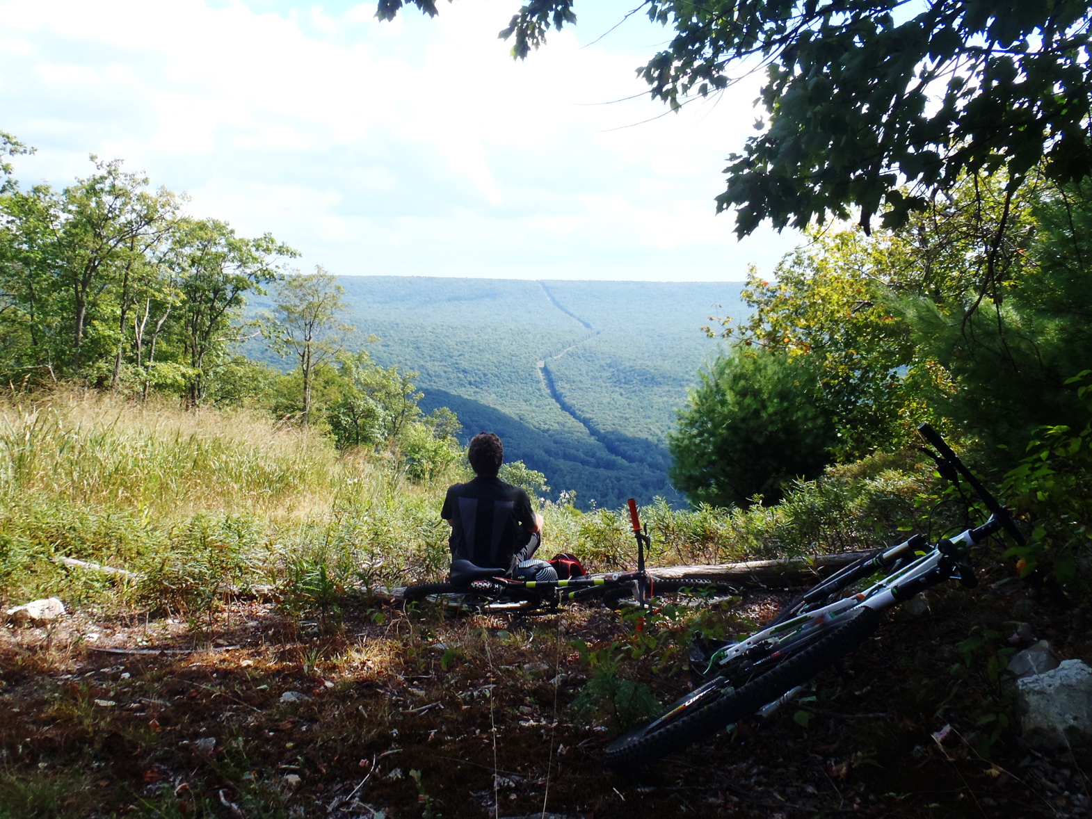 We emerged onto the road and pedaled side-by-side on the asphalt for a while, talking, laughing, just enjoying the day. At Penn Roosevelt State Park, we began the climb up Grass Mountain on a slightly-overgrown dirt road, gradually ascending before turning back onto the singletrack of Long Mountain Trail. And then we really went up. The trail was steep, so steep I ended up walking most of it, and even then, my legs still burned. After what seemed like forever, the trail finally flattened and then began to descend again, through the understory of mountain laurel, emerging onto a powerline cut. We found a spot in the shade, sat on a log, and munched on KIND bars while gazing off into the distance at the mountains and valleys and the road below.