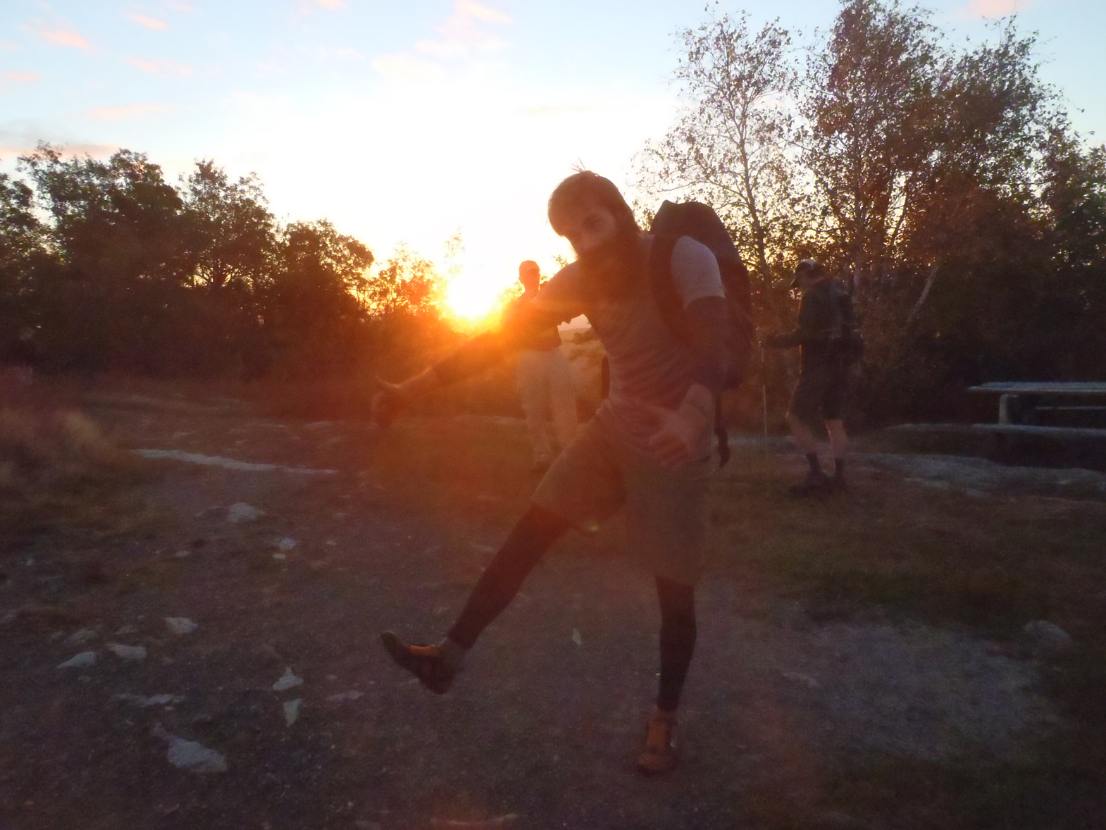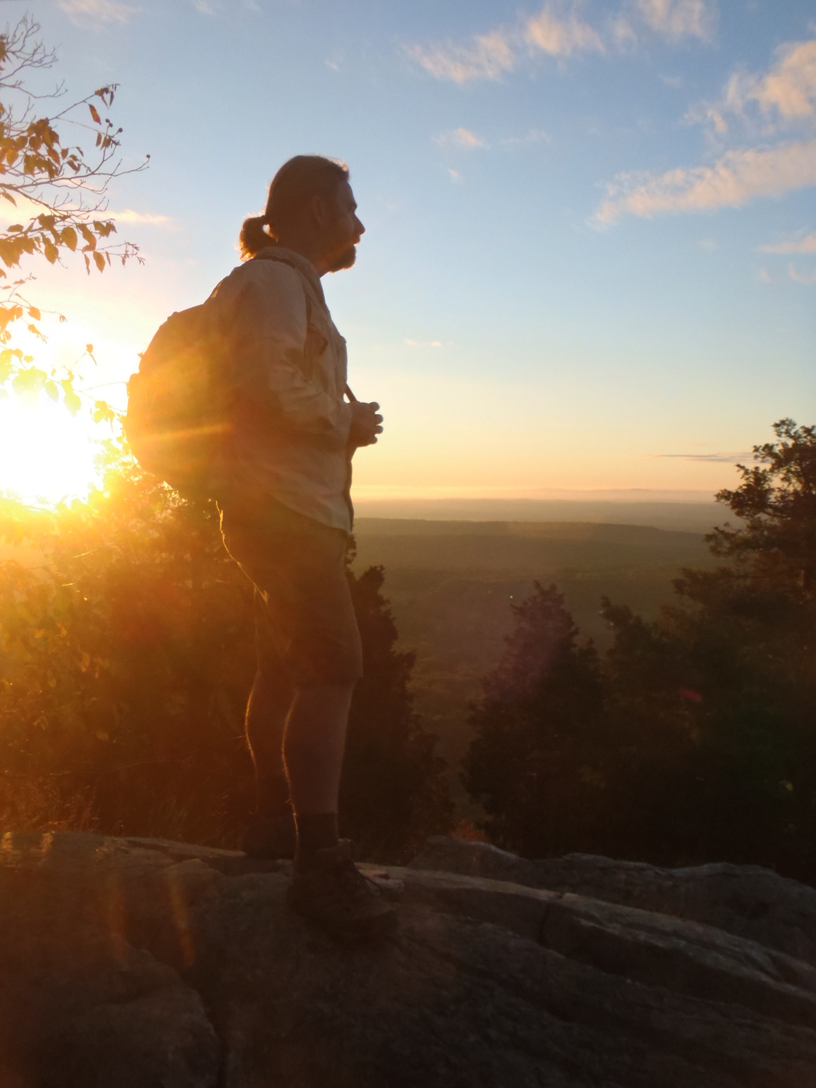 We reached a fire tower at the top of the hill just in time for the sunrise, and several of us threw off our packs and ran up the tower for a magnificent view that promised a beautiful day. The low-angled sun bathed everything in a reddish golden light, accentuating the warm colors of fall.