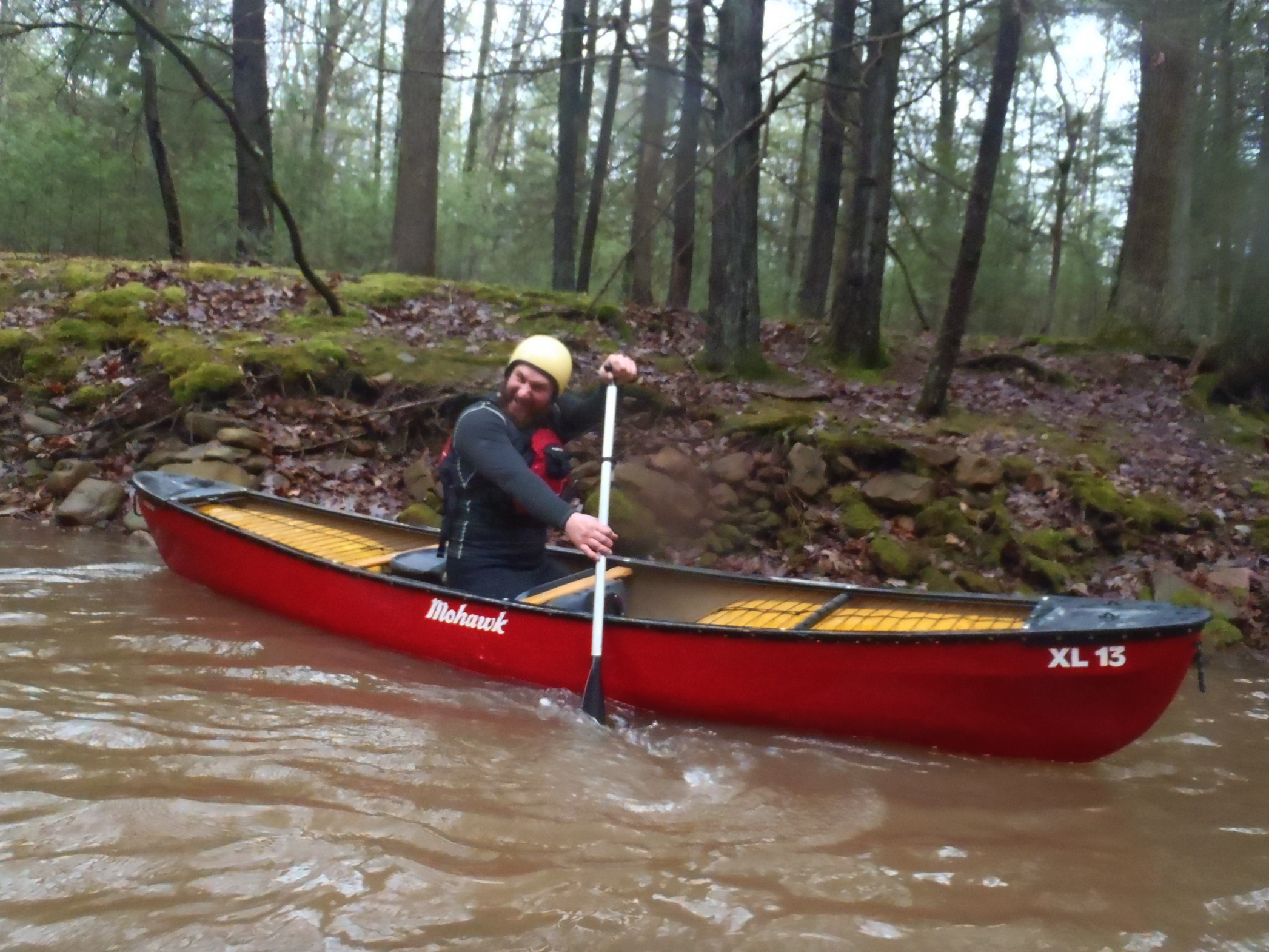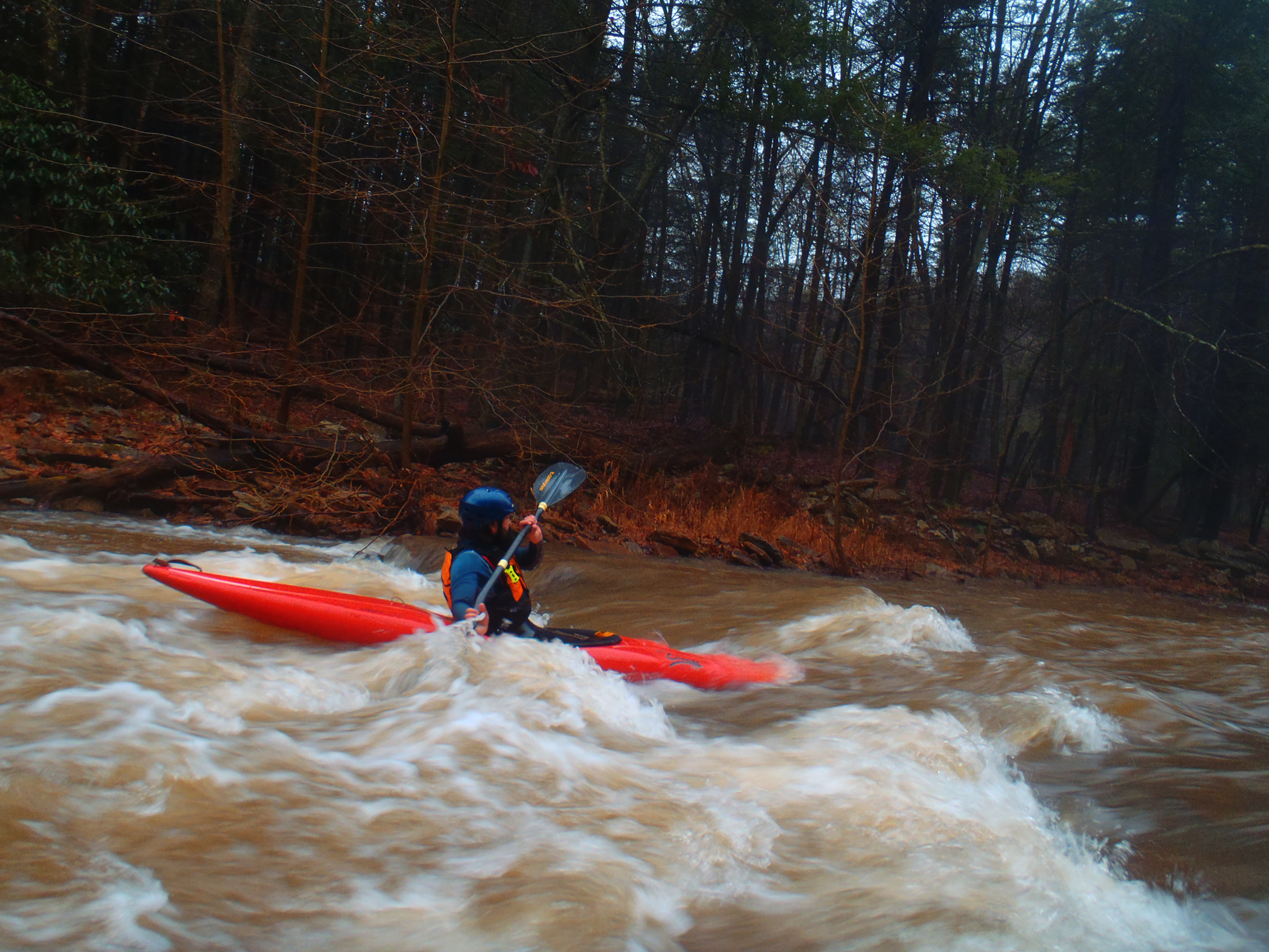 We got everybody geared up and hit the water once again, this time with a couple more inexperienced paddlers. We had them practice grabbing eddies and pulling off other simple maneuvers that could be useful in saving oneself in a sticky situation. Levin, who didn’t make it all the way down the creek last time he paddled it because he swam too many times in 19-degree temperatures, only swam once today, and finally was able to make it all the way to the take-out.