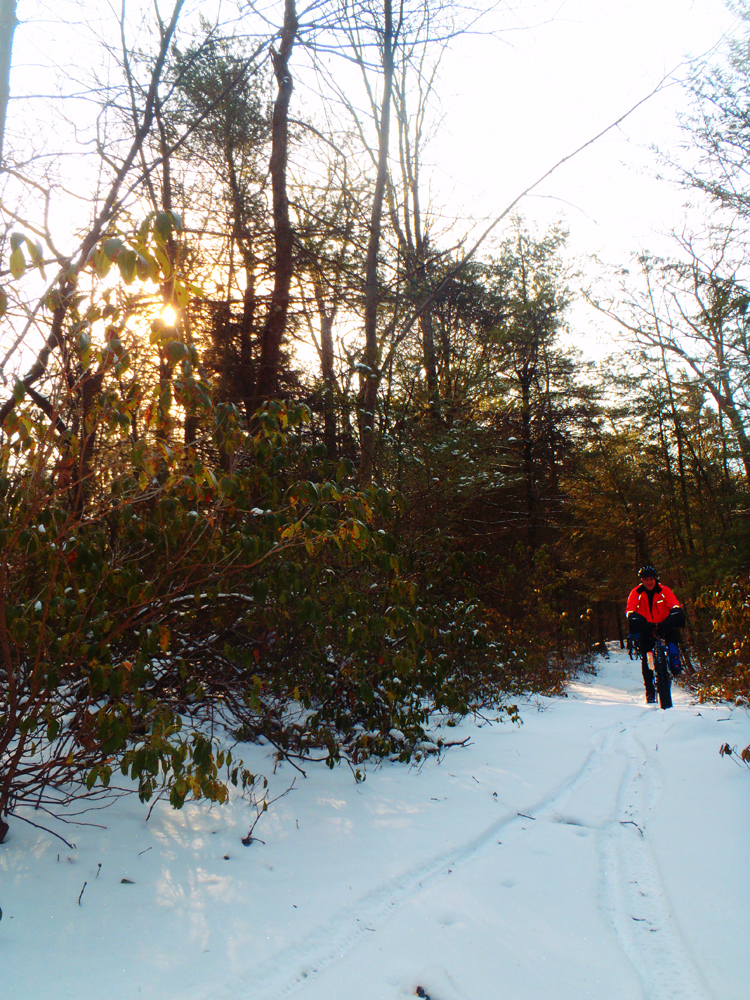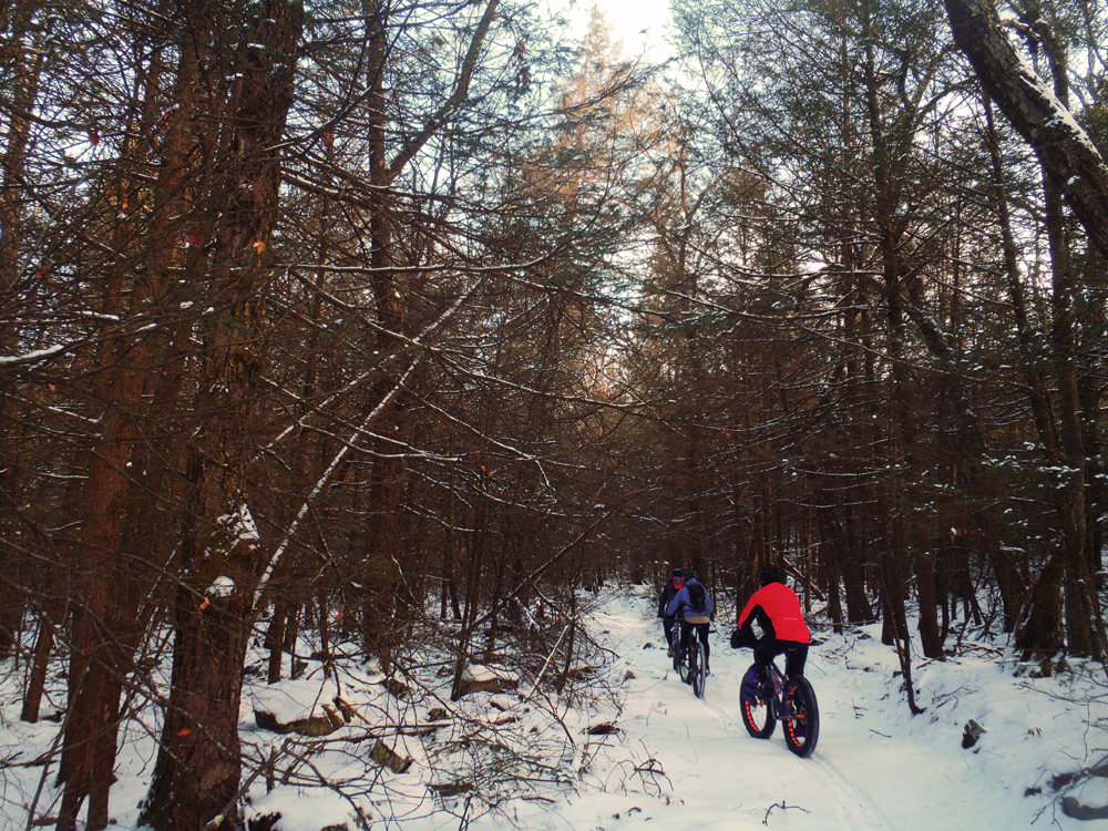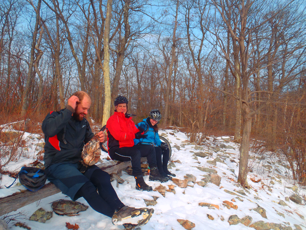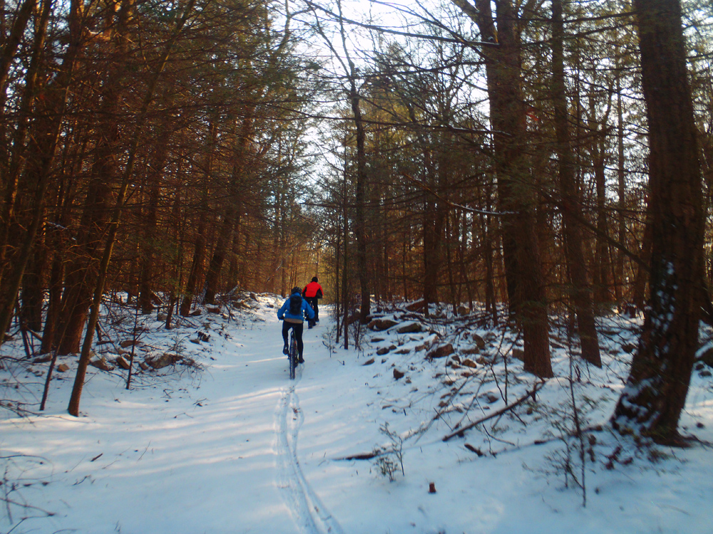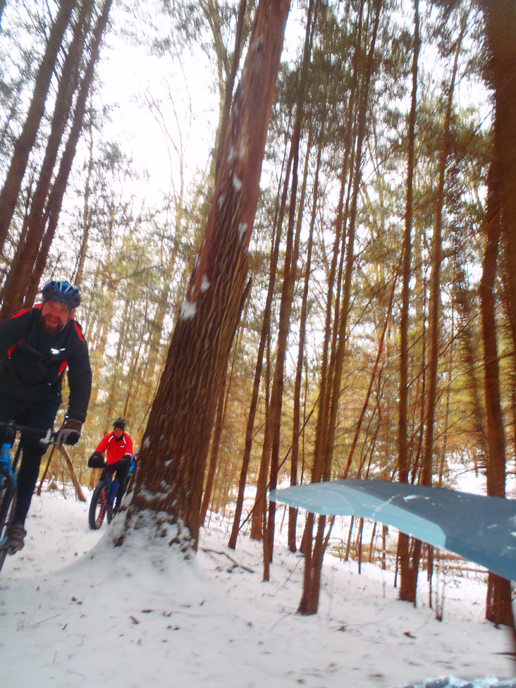 Today was one of those great rides. A couple inches of powdery snow covered the trails—just enough to make for a quintessential winter ride without the difficulty of slogging through 6 inches of slippery white slush. I felt great physically and mentally—finally a break in the “biking funk” I feel as though I’ve been in for the past few weeks. And our quartet of Evan, Jalon, John, and myself was an easygoing crew who was up for a challenging ride but also just wanted to have fun.