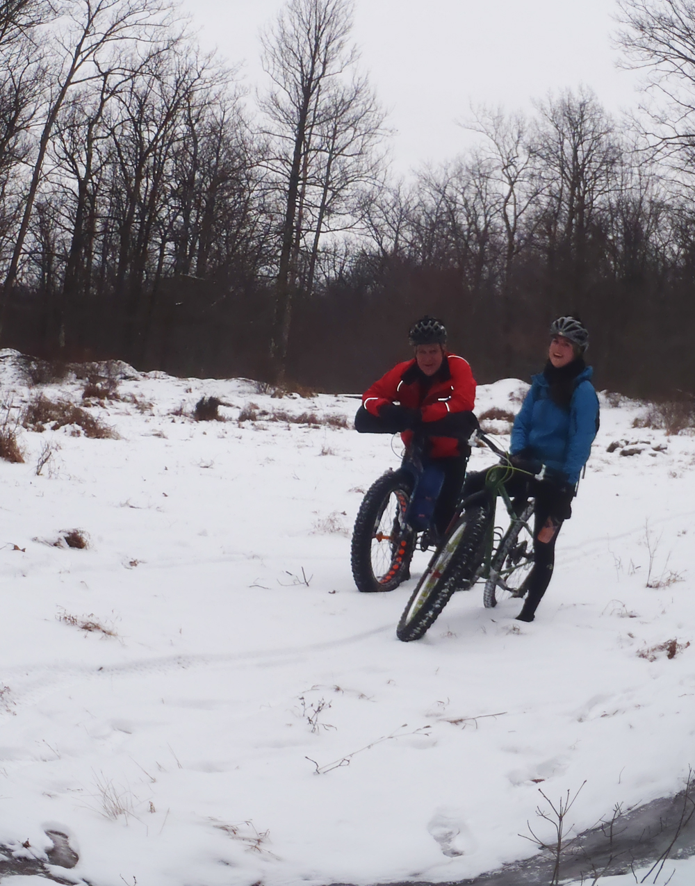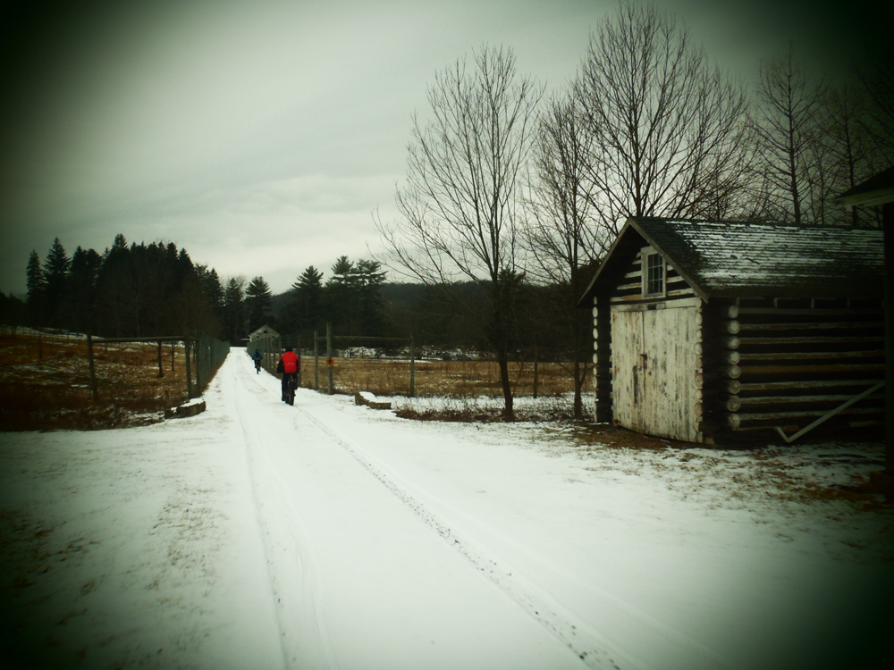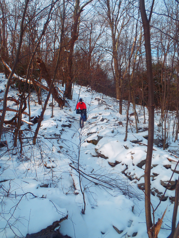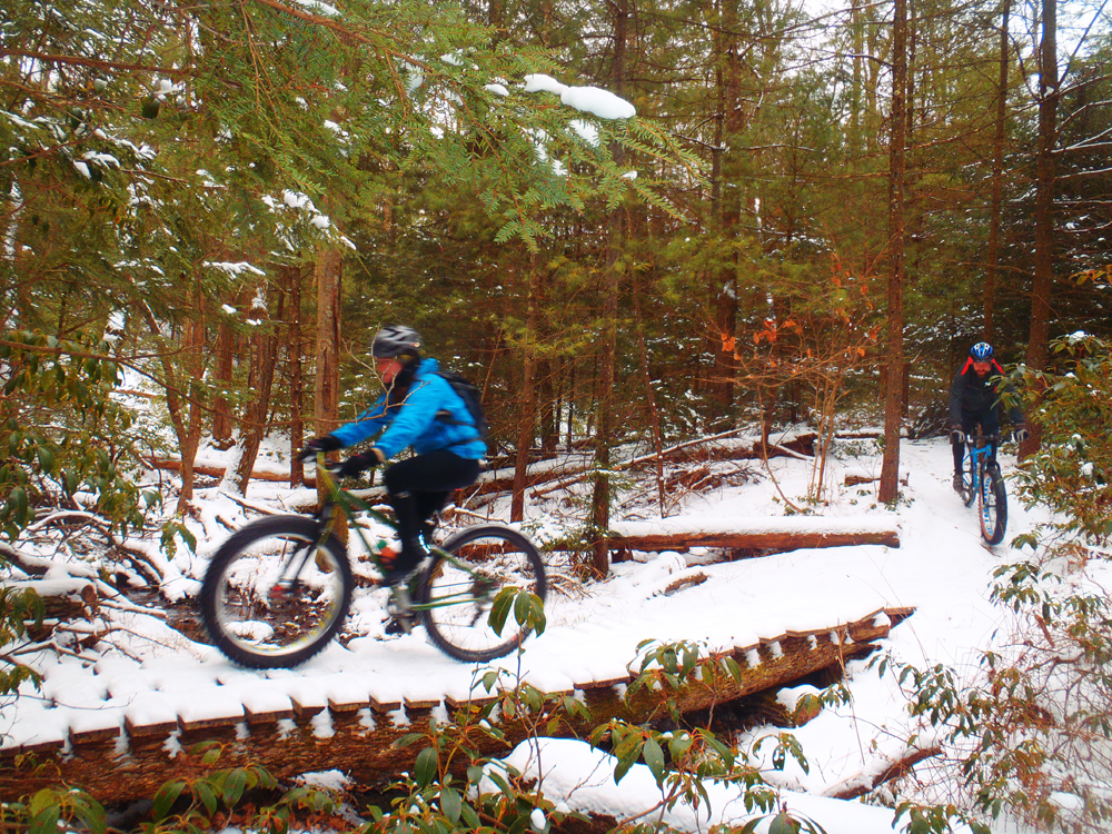 Today was one of those great rides. A couple inches of powdery snow covered the trails—just enough to make for a quintessential winter ride without the difficulty of slogging through 6 inches of slippery white slush. I felt great physically and mentally—finally a break in the “biking funk” I feel as though I’ve been in for the past few weeks. And our quartet of Evan, Jalon, John, and myself was an easygoing crew who was up for a challenging ride but also just wanted to have fun.