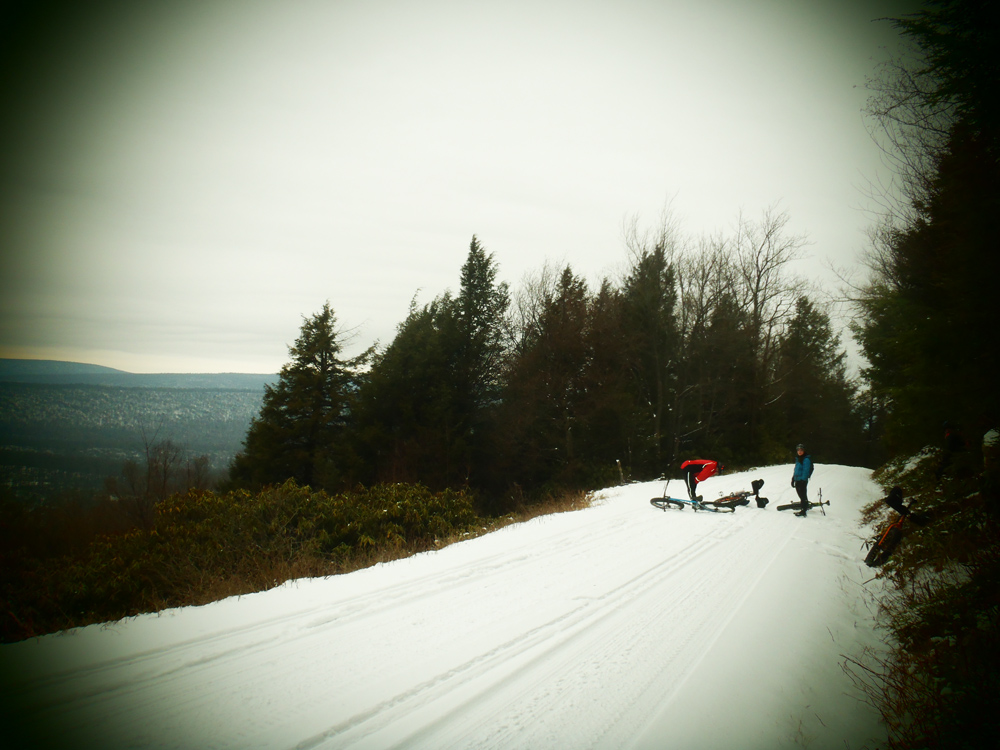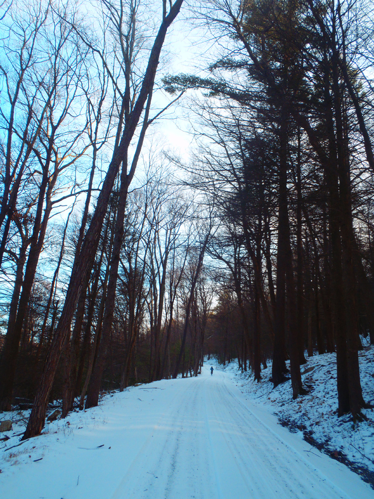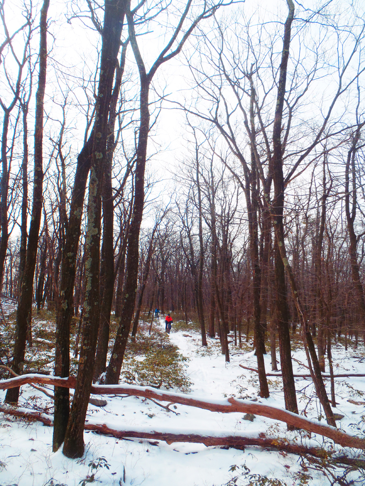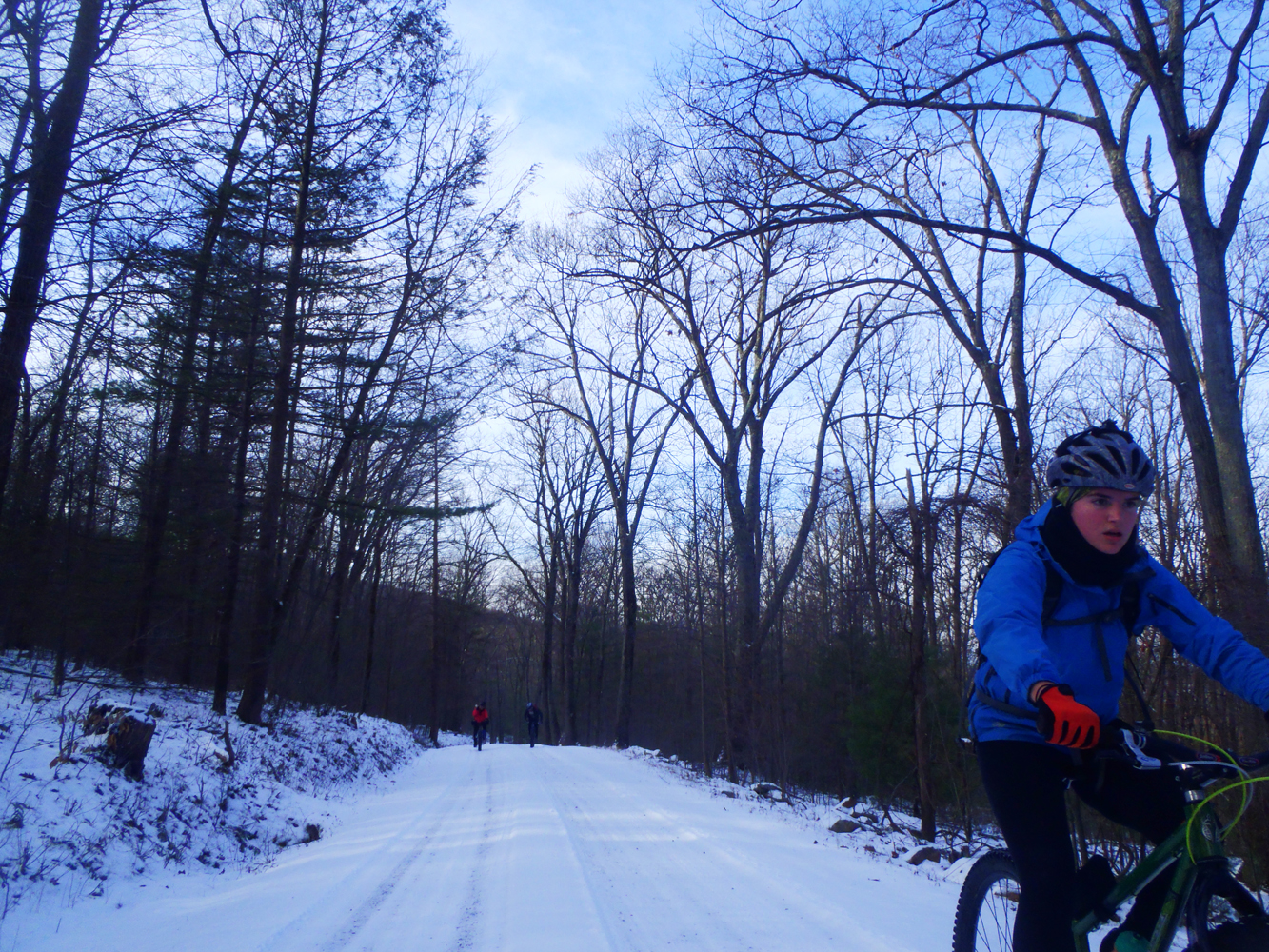 Soon, we were bombing down Sassafras Trail towards Flat Road, a steep downhill full of loose rocks that was made extra slippery by the now-softening snow. On almost too many occasions to count, I found my tires sliding out from under me, and myself flying off the bike. My bike acquired a few new dings, and my legs acquired a few new bruises, but that’s usually expected from a ride at Rothrock.