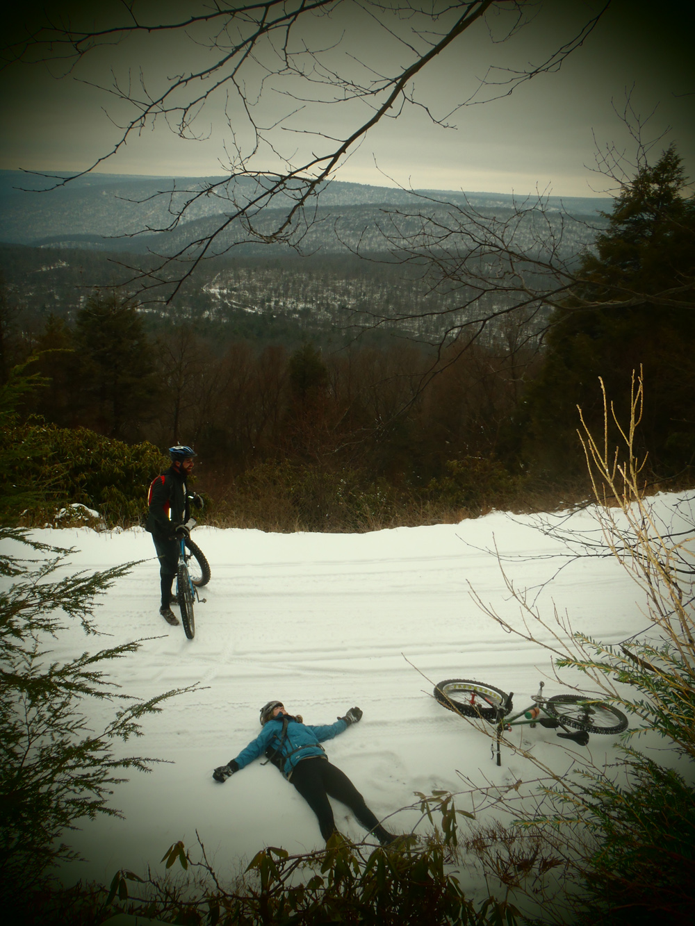 By the time we got back to the road, I was beginning to feel the exhaustion set in. But we still had to climb all the way back up the mountain and down the other side to the car. Climbing up Kettle Road was painful—my legs felt like they had nothing left, my lungs wanted to explode, and I was having trouble getting my head into that zone that blocks it all out. Just keep pedaling, I told myself over and over. We finally reached the top, and I fell into the snow, laughing, so happy to have made it.