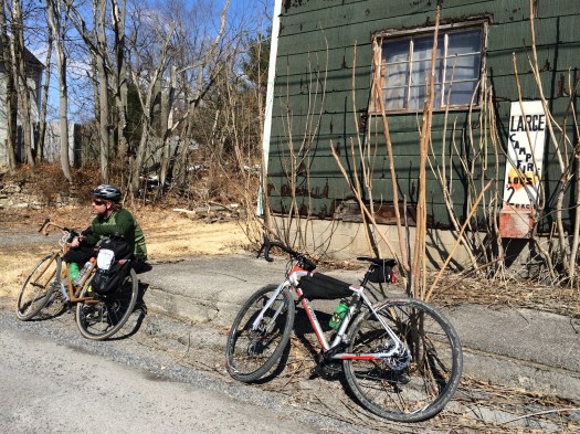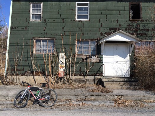 We kept a leisurely pace, stopping a lot, taking pictures, chatting. Jeff discovered a perfectly good coffee mug by the side of the road and just couldn’t resist picking it up and stuffing it into his pannier. We looped back to Mactown, forming a lollipop, and ended up stopping for a break at the run-down old building I had so admired earlier. I took a picture this time. We munched on beef jerky and energy chews before heading off in a different direction than before, through Hartslog Valley to Petersburg.