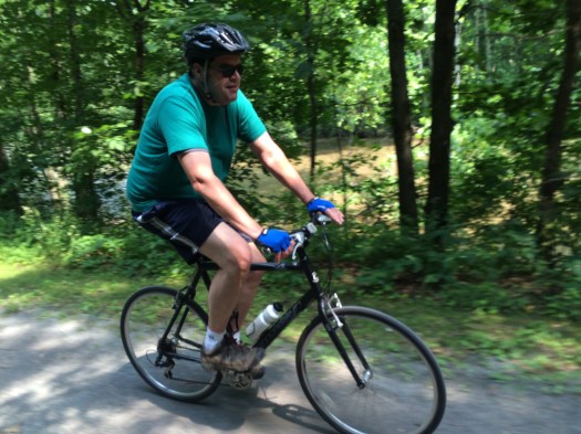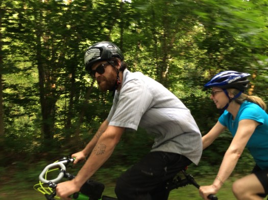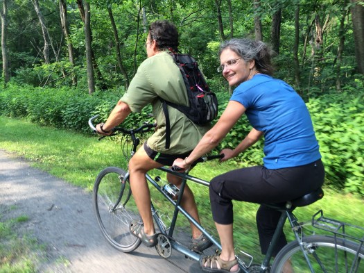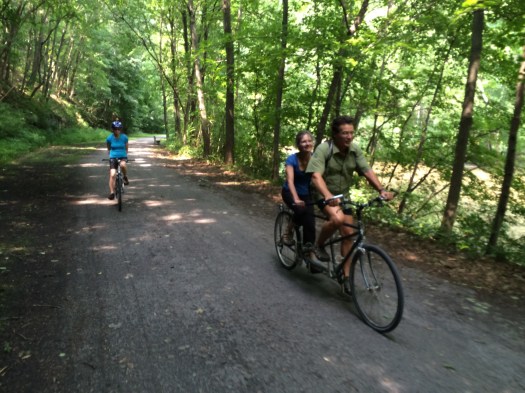 This past Sunday, Evan’s parents visited us for the day. We took bikes to the local rail-trail, the Lower Trail, where we were joined by my parents, who decided to try out a tandem bicycle for the first time.