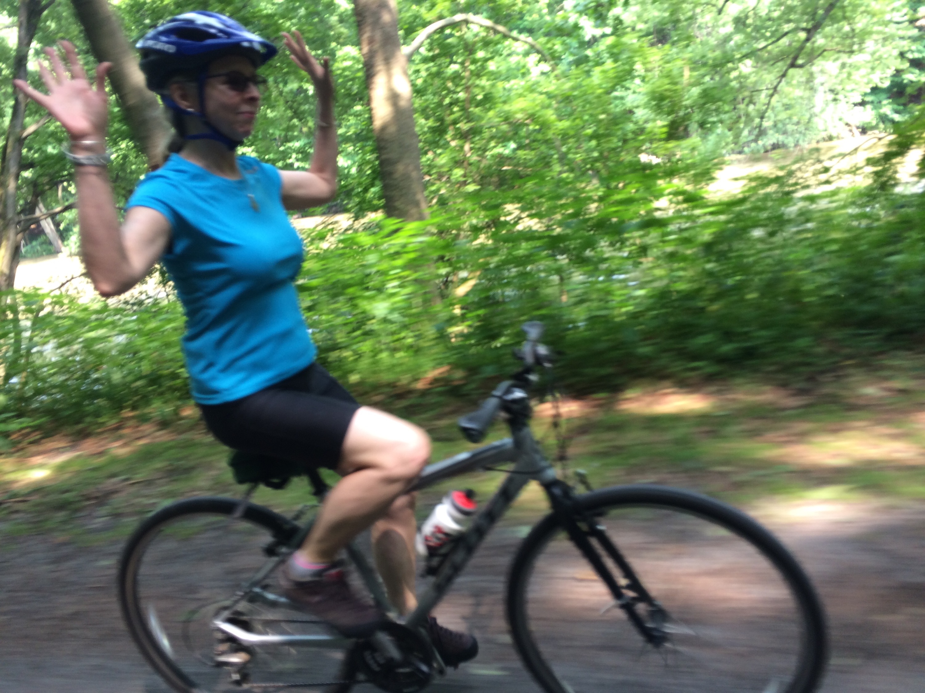 On the way back from Williamsburg, Evan’s mom got on the back of the Powderkeg with him, and I rode her bike.
