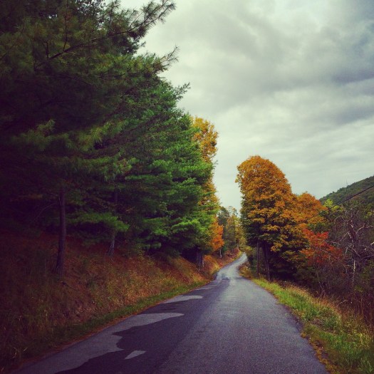 The miles on 26 flew by today. I’m getting faster. I made the sweeping right turn onto Murray Run. I could relax. It’s rare for me to see a car on this road. I stopped a couple times to take pictures of the changing leaves. It began to drizzle again. Oh well. It would probably stop soon.