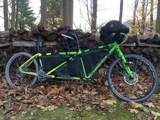 Since we purchased our Salsa Powderkeg tandem in June, it’s seen several different incarnations. First, we set it up as a full-on mountain bike, but a plethora of mechanicals proved that it’s a ride way more suited for mountain touring than singletrack shredding, and so that’s the direction it’s been moving. Then we decided to ride it the 200 miles to Evan’s parents house for Thanksgiving, so it became a road touring bike, designed to go far and fast.