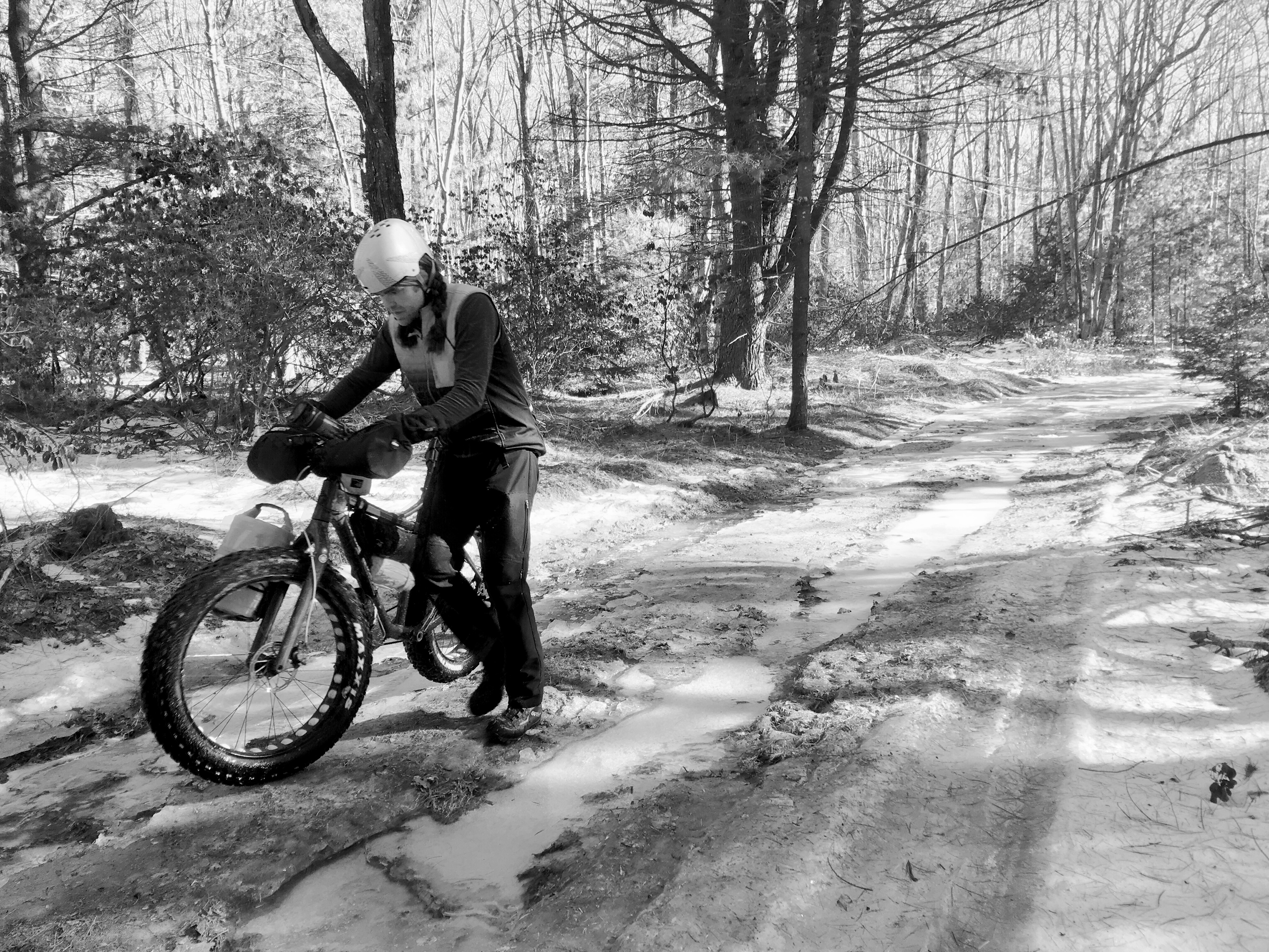 After a quick stint on the pavement, we turned into the woods on doubletrack. Last week’s thaw and subsequent flash freeze had transformed the snowmobile trail into a sheet of ice in spots where it had been packed down by the sleds, so it was slower going than anticipated. I was thankful for my studded tires, especially considering I was convinced I wouldn’t need them. Since putting them on a few weeks ago, I’ve been on a few rides where they were sort of nice but not necessary — this time, they made all the difference.