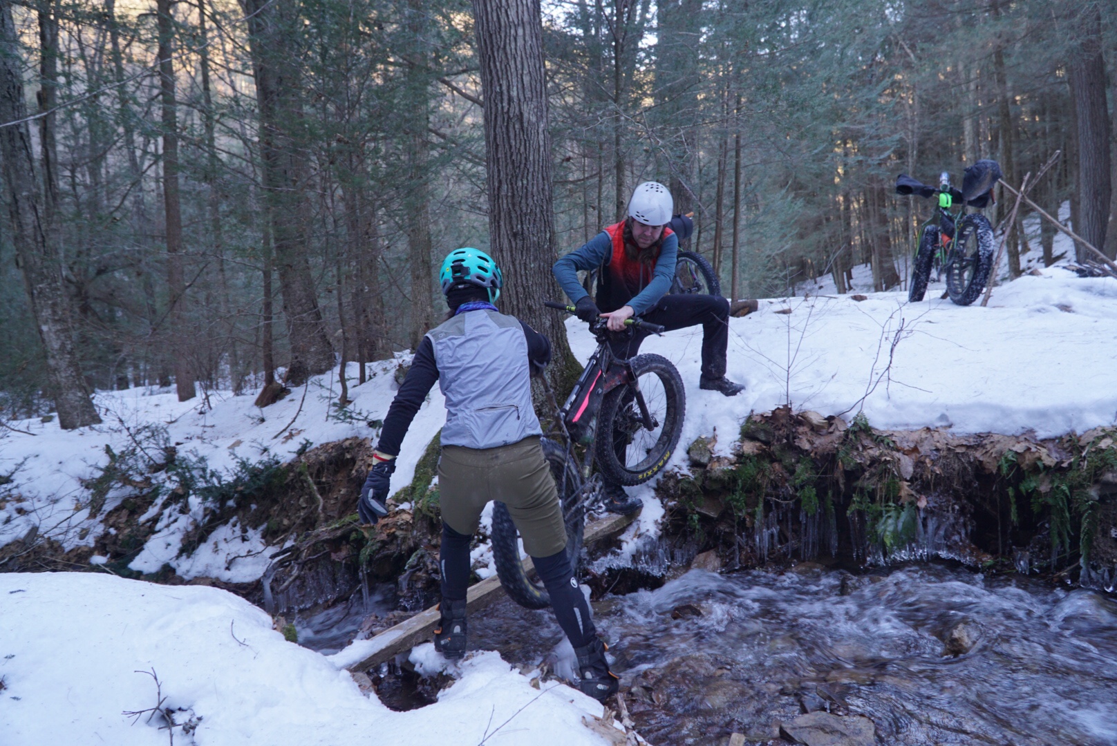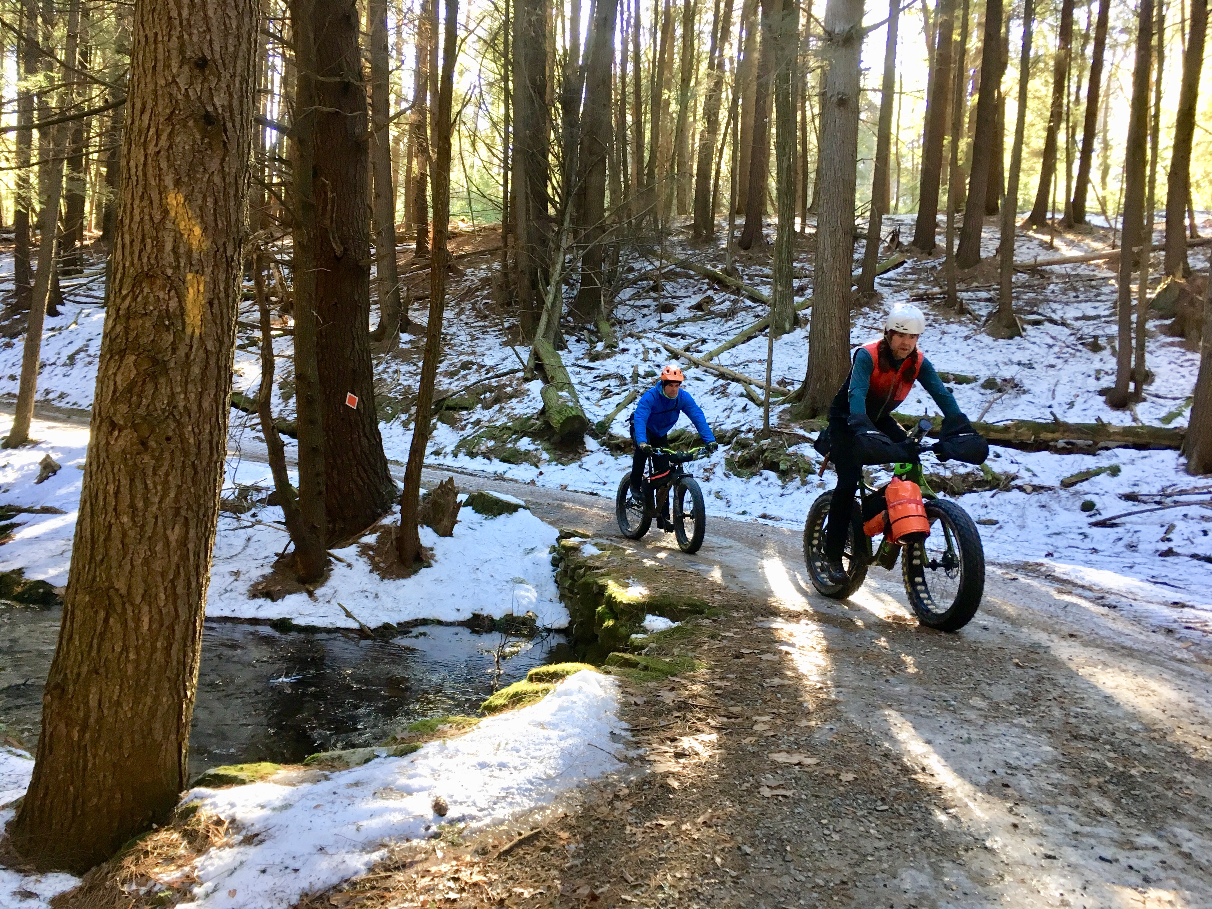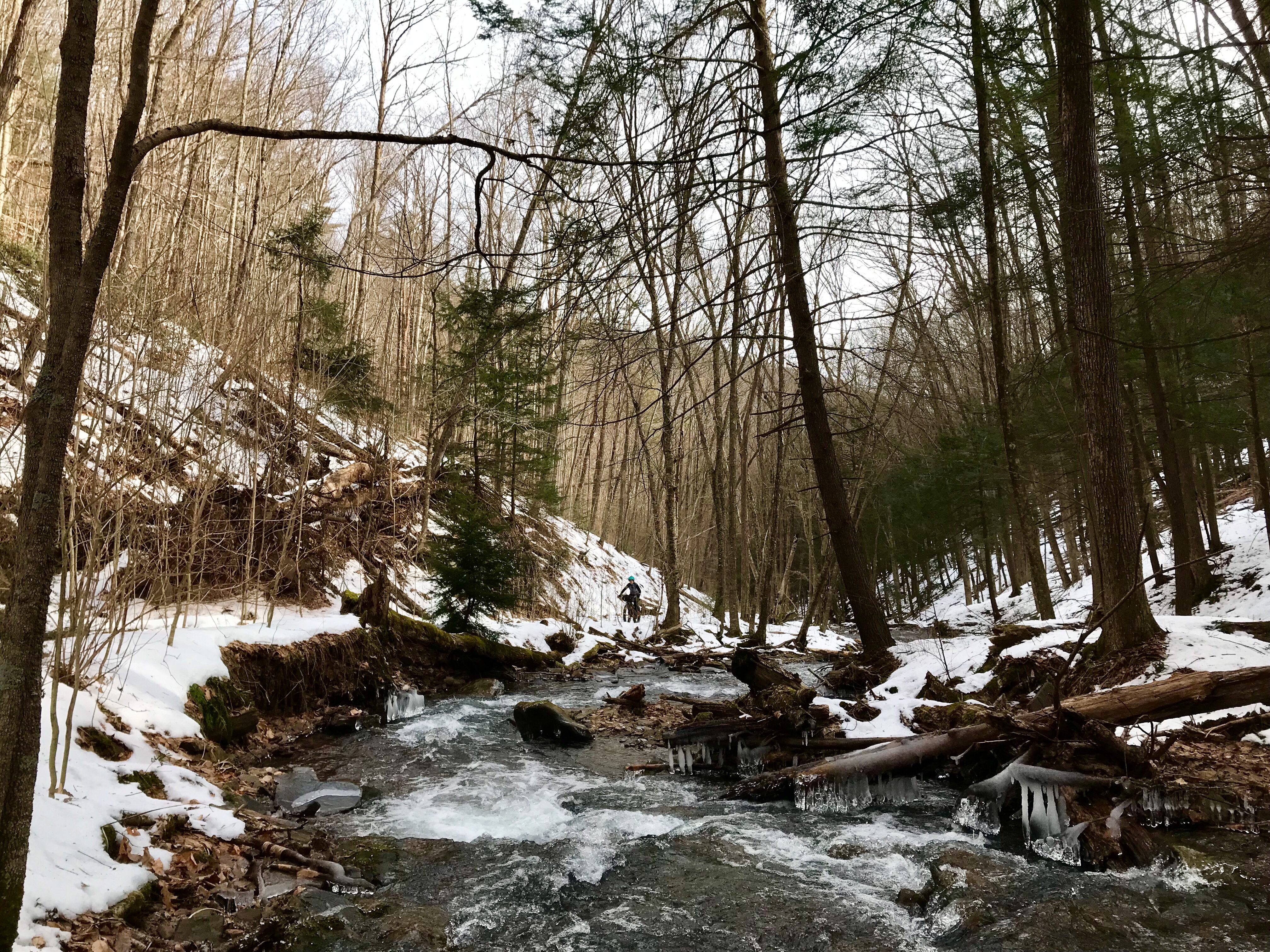 The next part of the ride was my favorite. We dropped down Bear Trap Trail, which was covered with a perfect amount of crunchy snow that left shimmering crystals rooster-tailing off our tires. The ever-sinking sun beamed picture-perfect rays of light through the pine needles. The gurgling ice-flanked stream to our right completed the idyllic image of winter in Pennsylvania. Though the trail was fast, faster than we’d been able to go all day, we all slowed to enjoy this moment, to relish in that feeling we live for —- to be outside in a beautiful place that we got to under our own power, with the camaraderie of good friends.