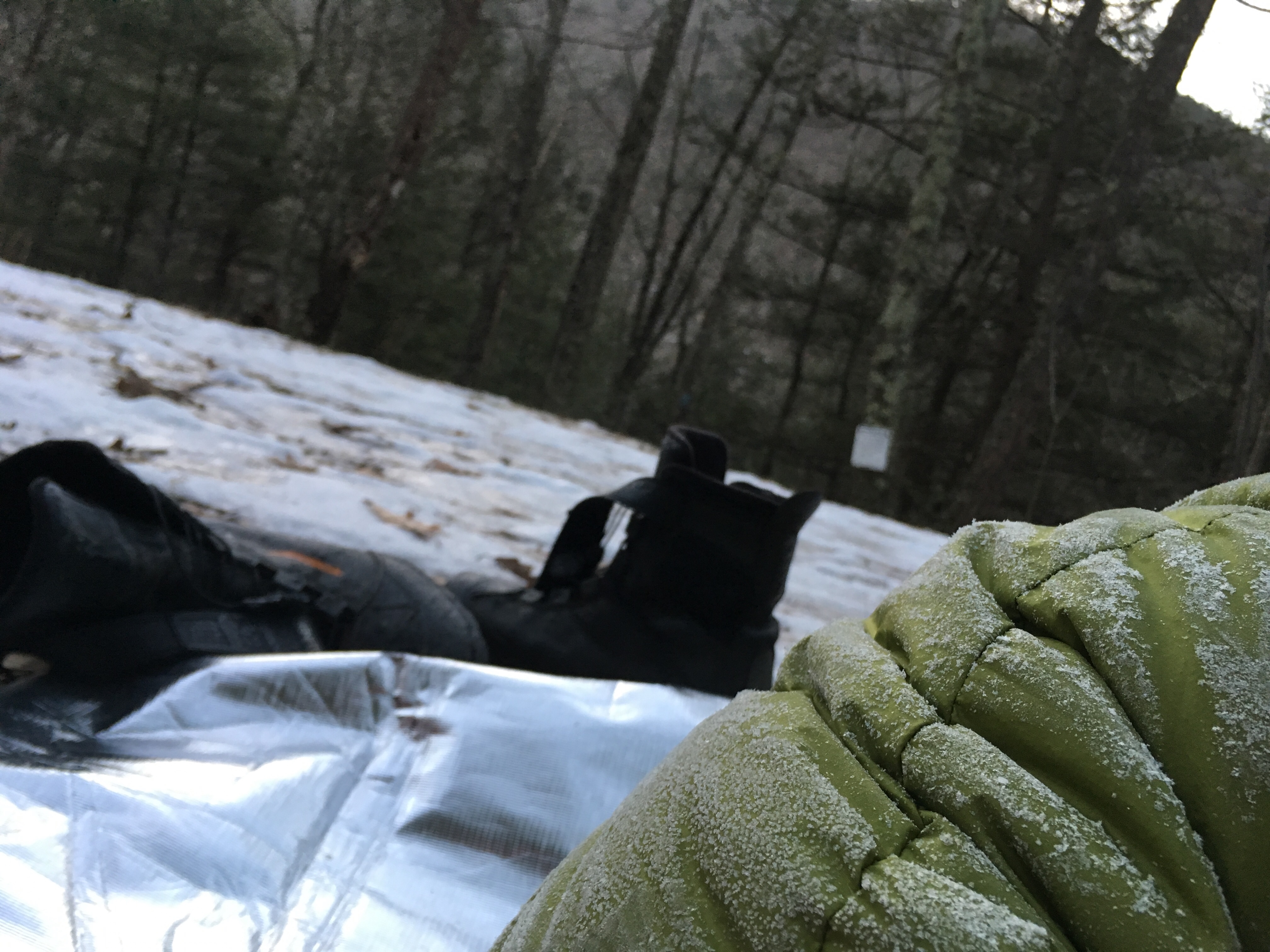 We slept on the ground in the open air, on a tarp with heat reflective material and insulated inflatable sleeping pads, in 0-degree-rated down bags. I changed my upper body base layer and had packed a down jacket to wear around camp — otherwise, I slept in the clothes I rode in. I brought extra socks that I never wore because the fire dried mine out sufficiently. I stayed warm all night, surprisingly so — more so than I had on previous winter bike overnighters even when temps weren’t quite as cold (on this trip, temps were in the mid-20s both days and dropped down into the low teens at night.).