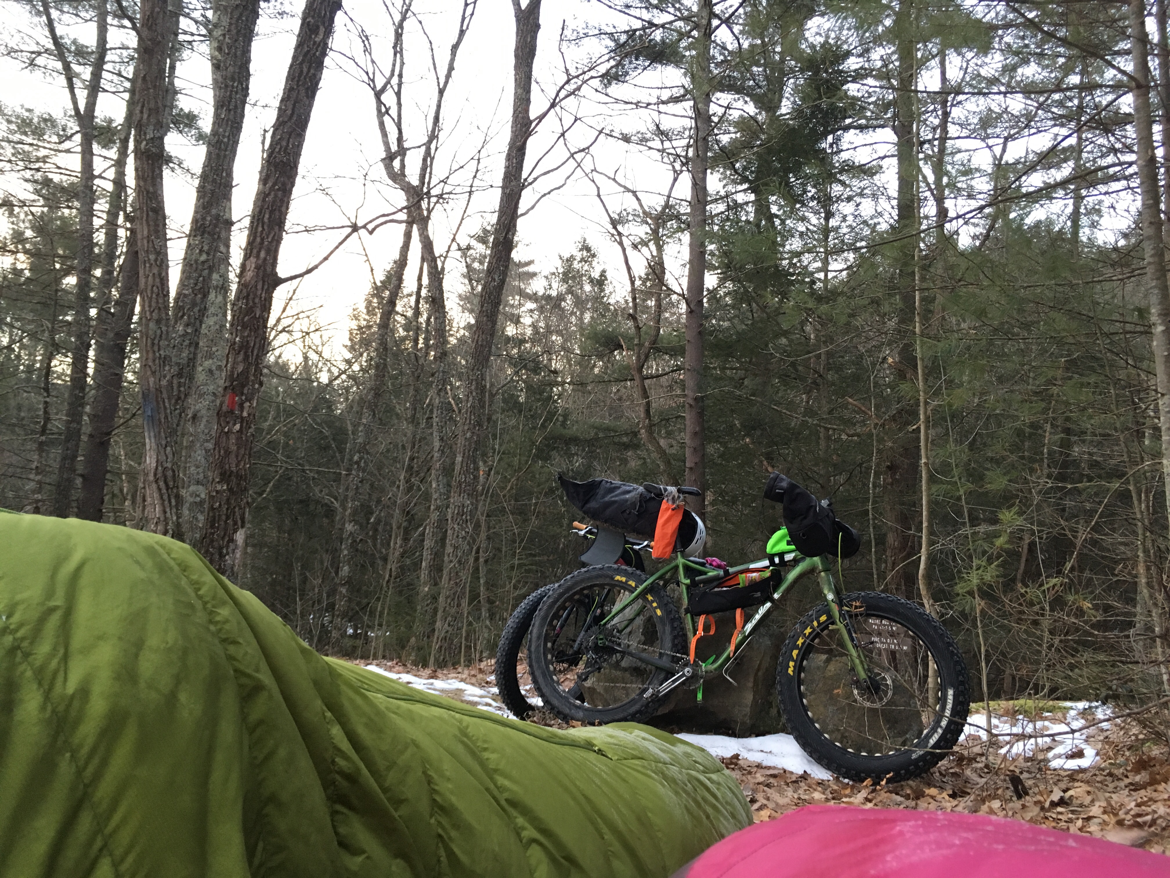 Winter camping is not for the faint of heart. Especially not winter bike camping. You ride all day, get sweaty (read: cold when you stop), then need to try to stay warm all night using only what you can carry on your bike. Then wake up in the morning and ride some more.