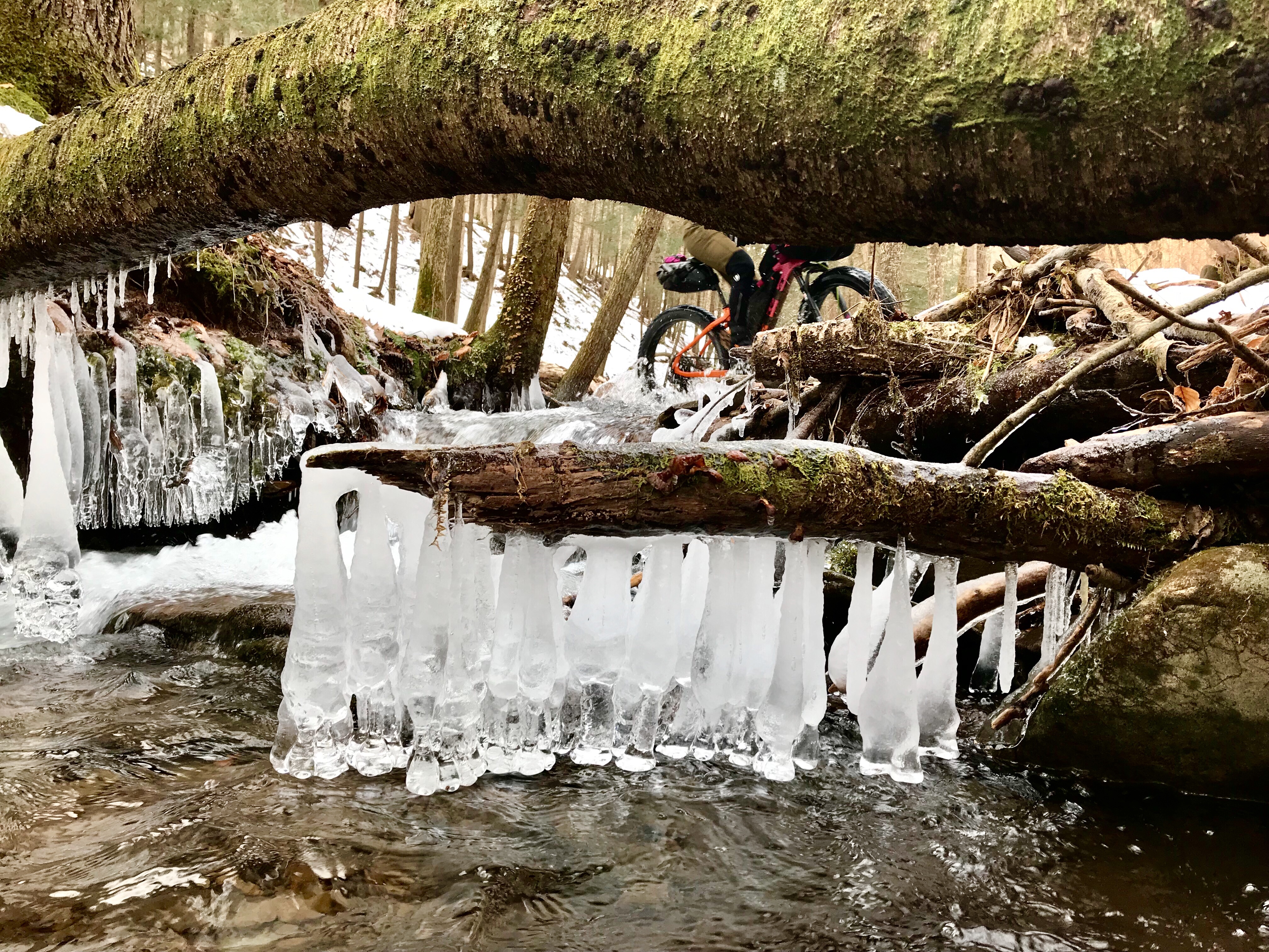 The grassy path was rolling, with endless punchy climbs. The ice theme continued, and one spot in a pine grove was not unlike a frozen waterfall. I rode up it just fine with my studs but Evan struggled to even get footing to push his bike. I was again thankful to have one less thing to worry about.