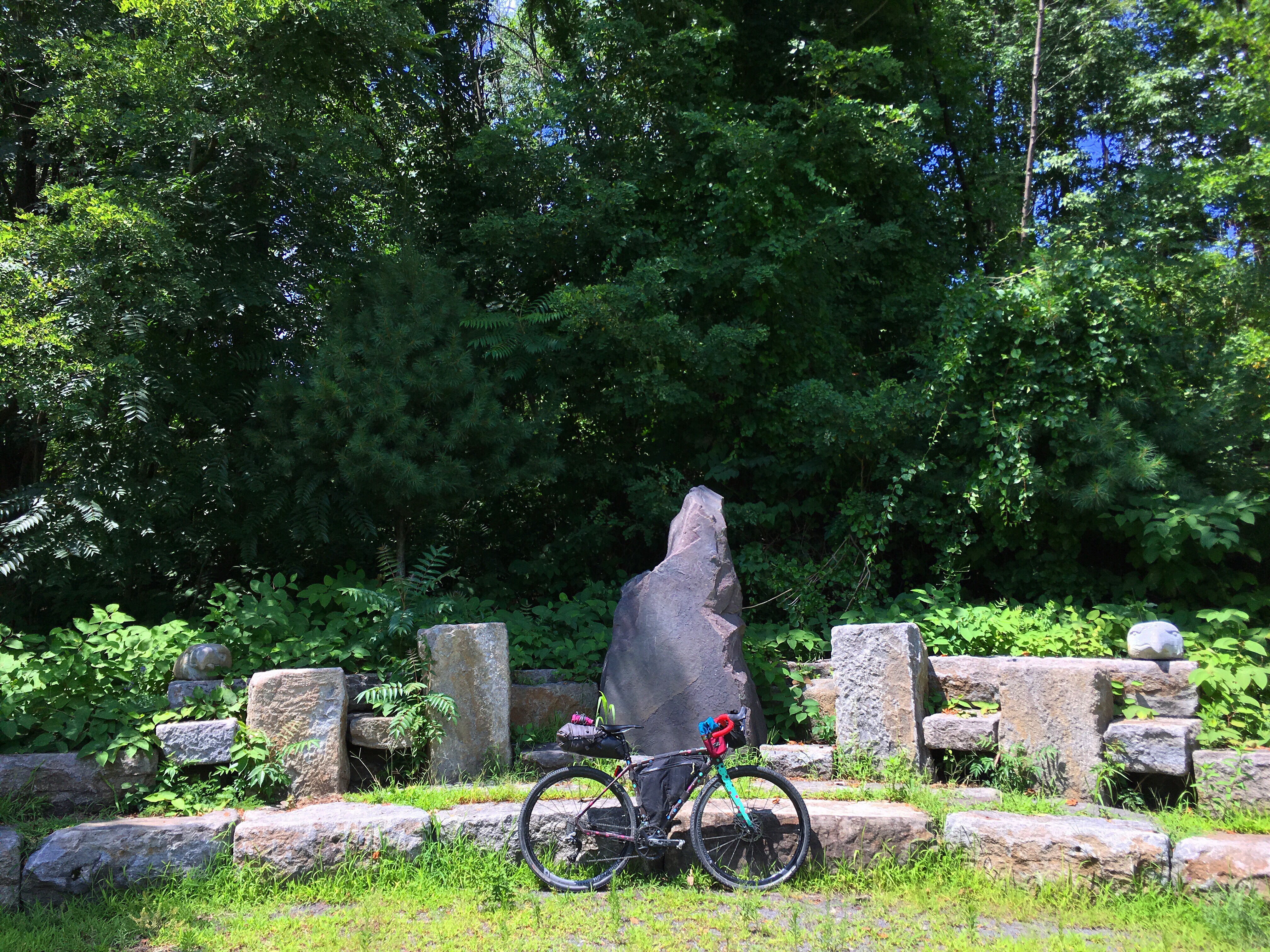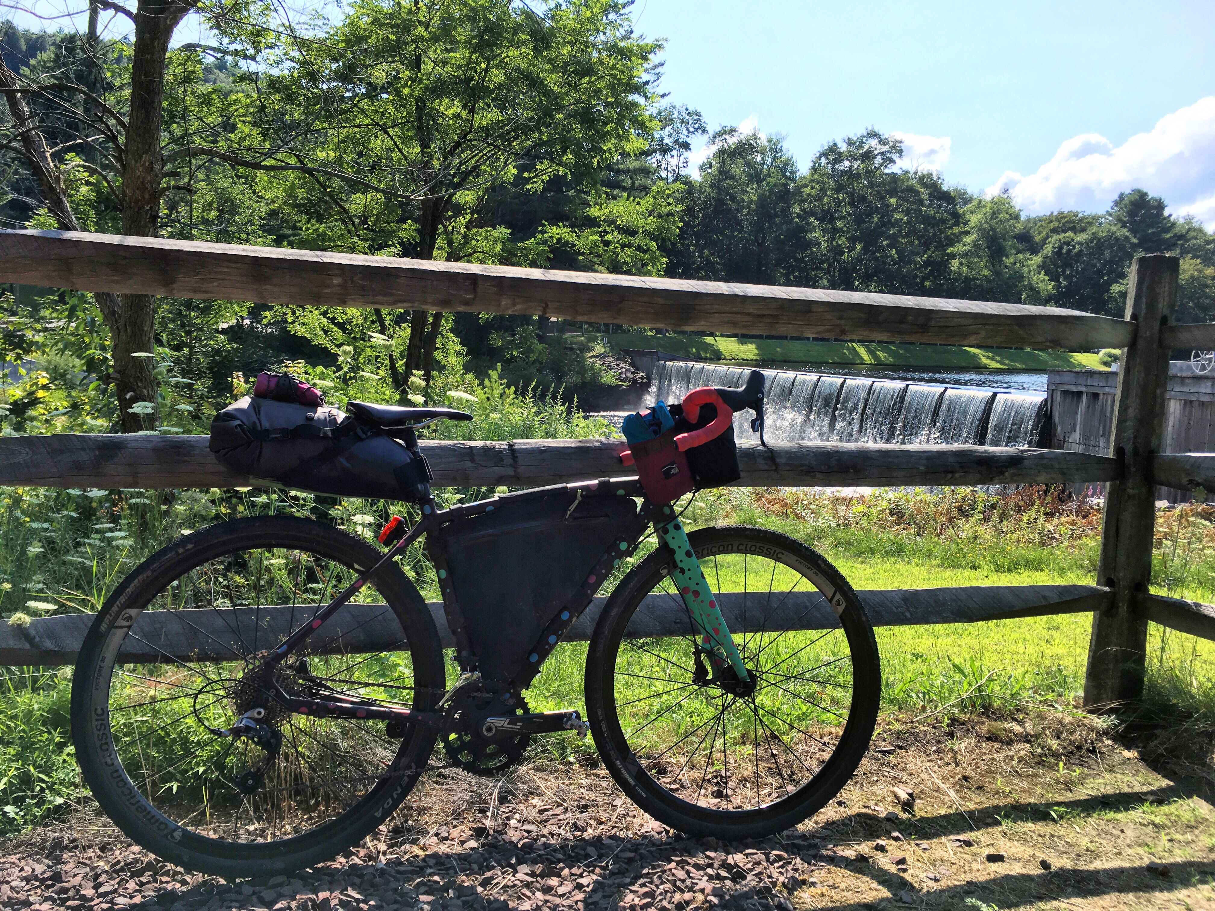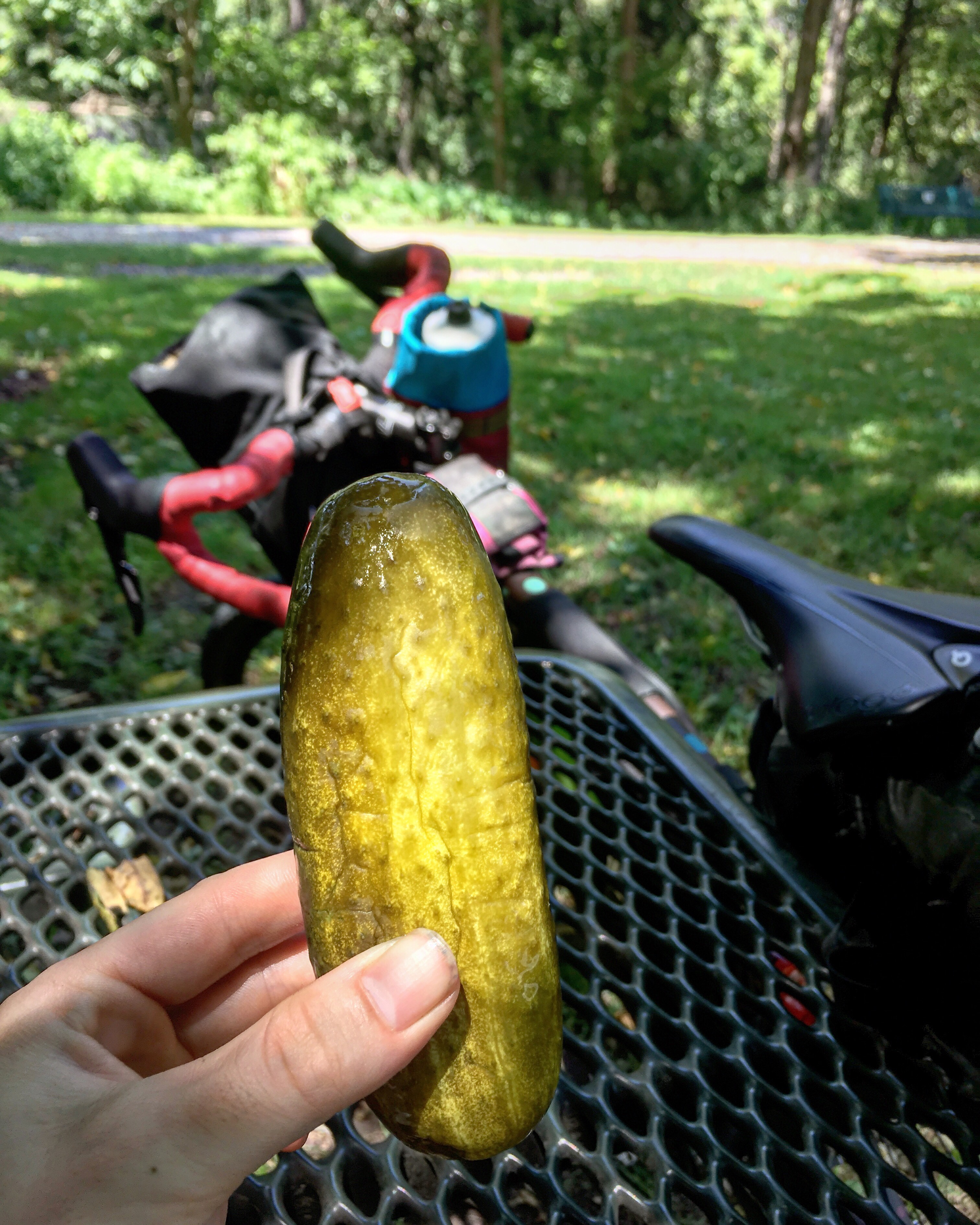 The Lehigh Valley was unbelievably hot. I ate my emergency pickle under a tree on the rail trail, but once I was on roads for the remainder of the day, there was no more shade to be found. I reapplied sunscreen and tried my best to keep up with my fluid intake, swapping my snacks for my water bottle in the easy-access Manything Bag on my bars. I was cooking to a crisp.