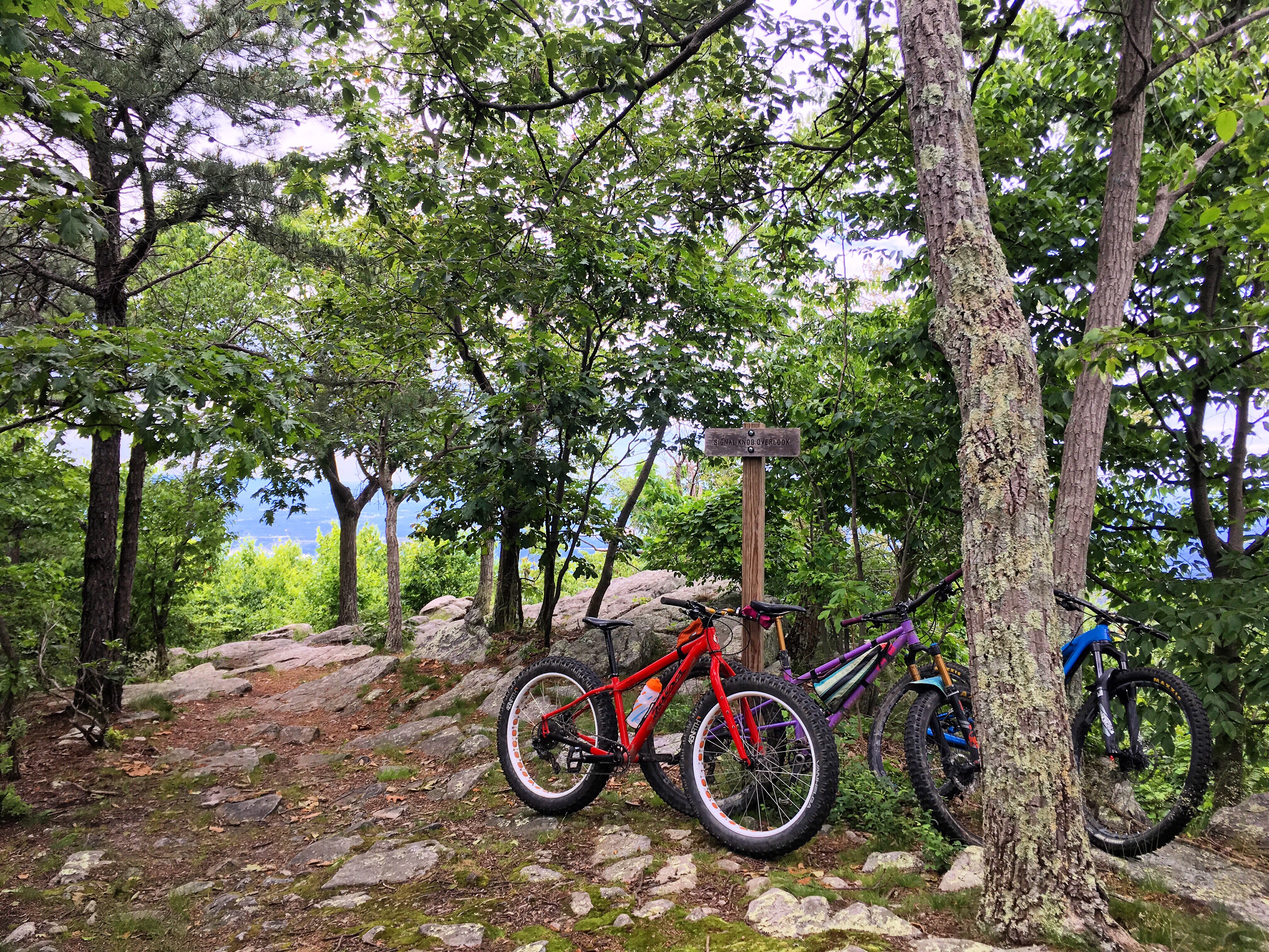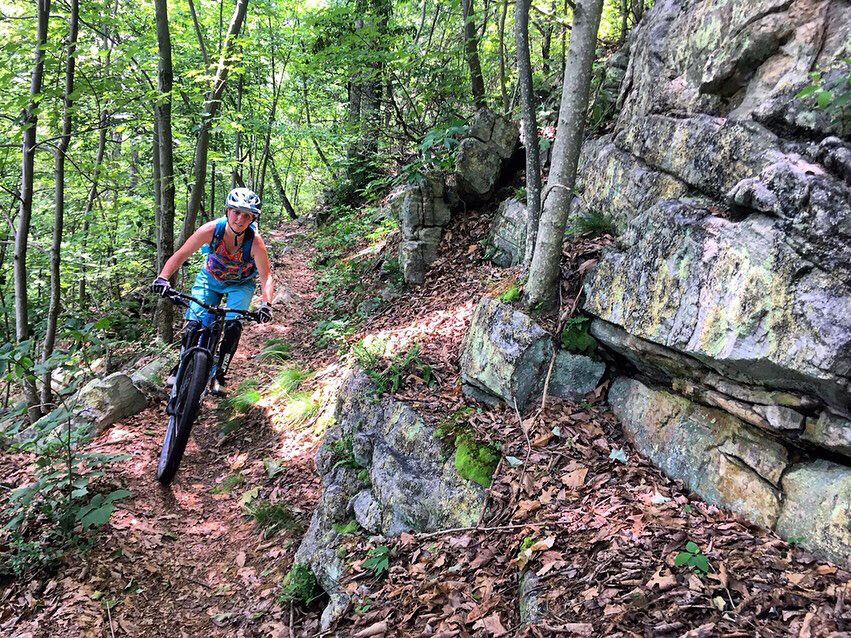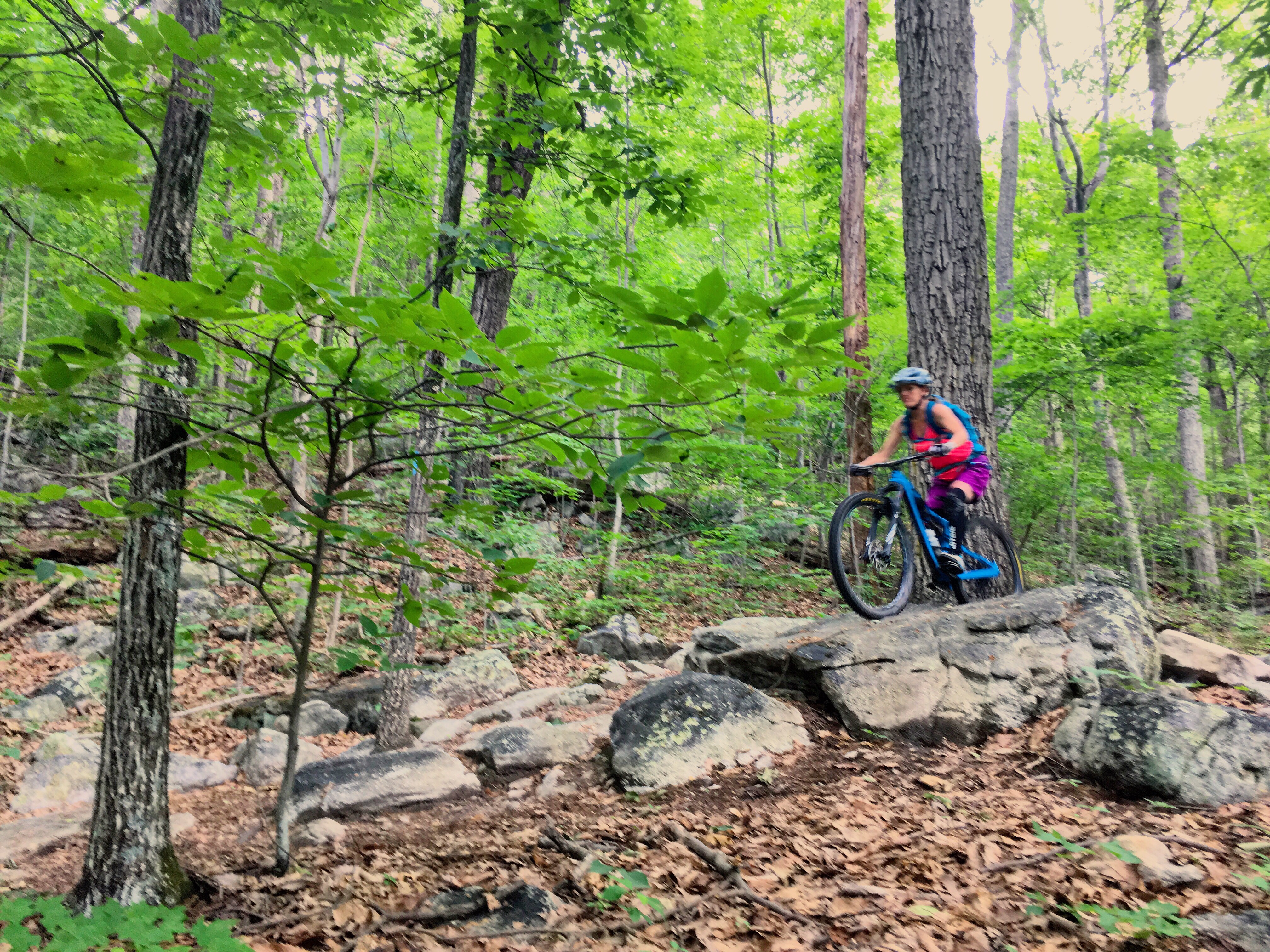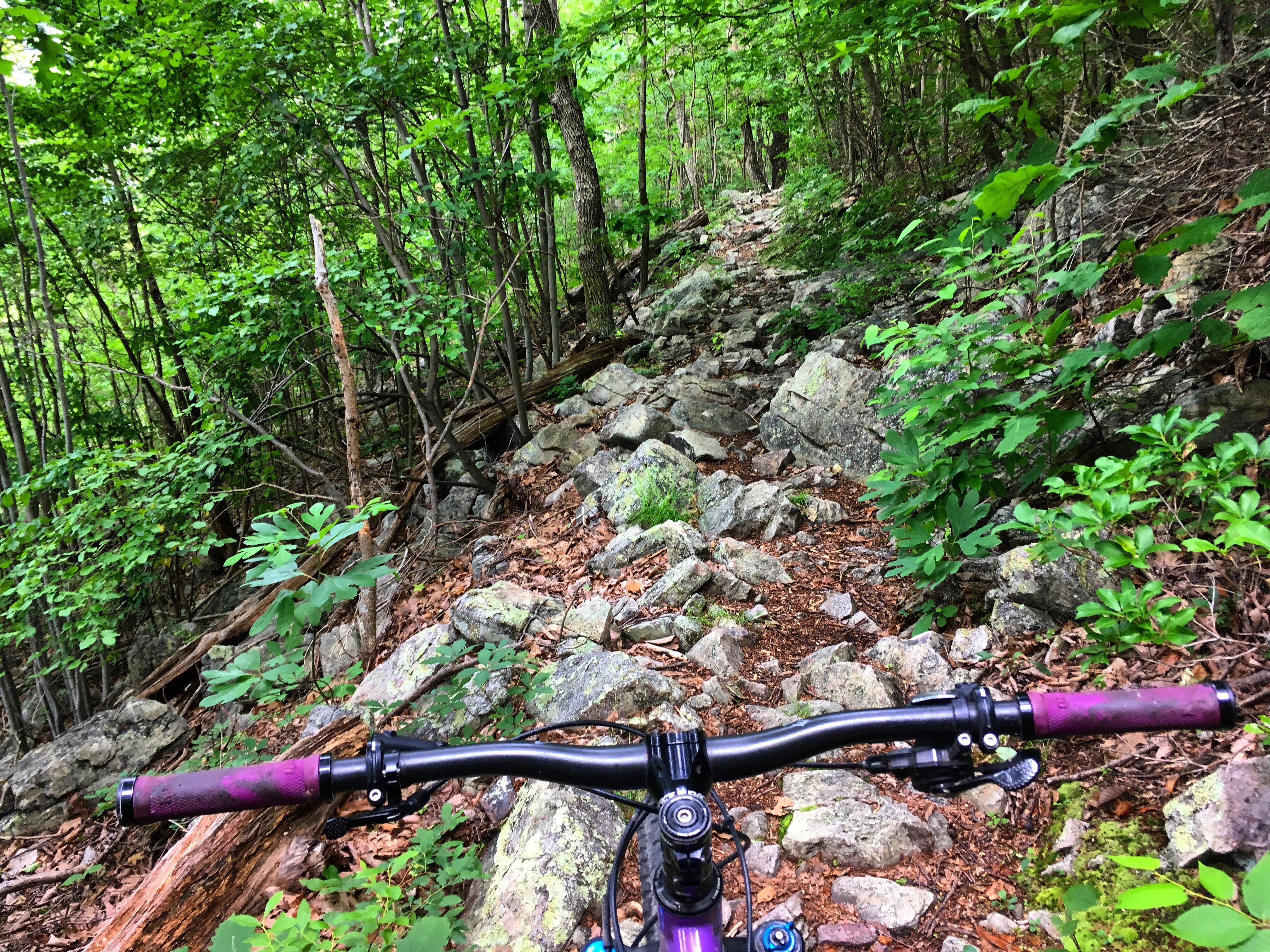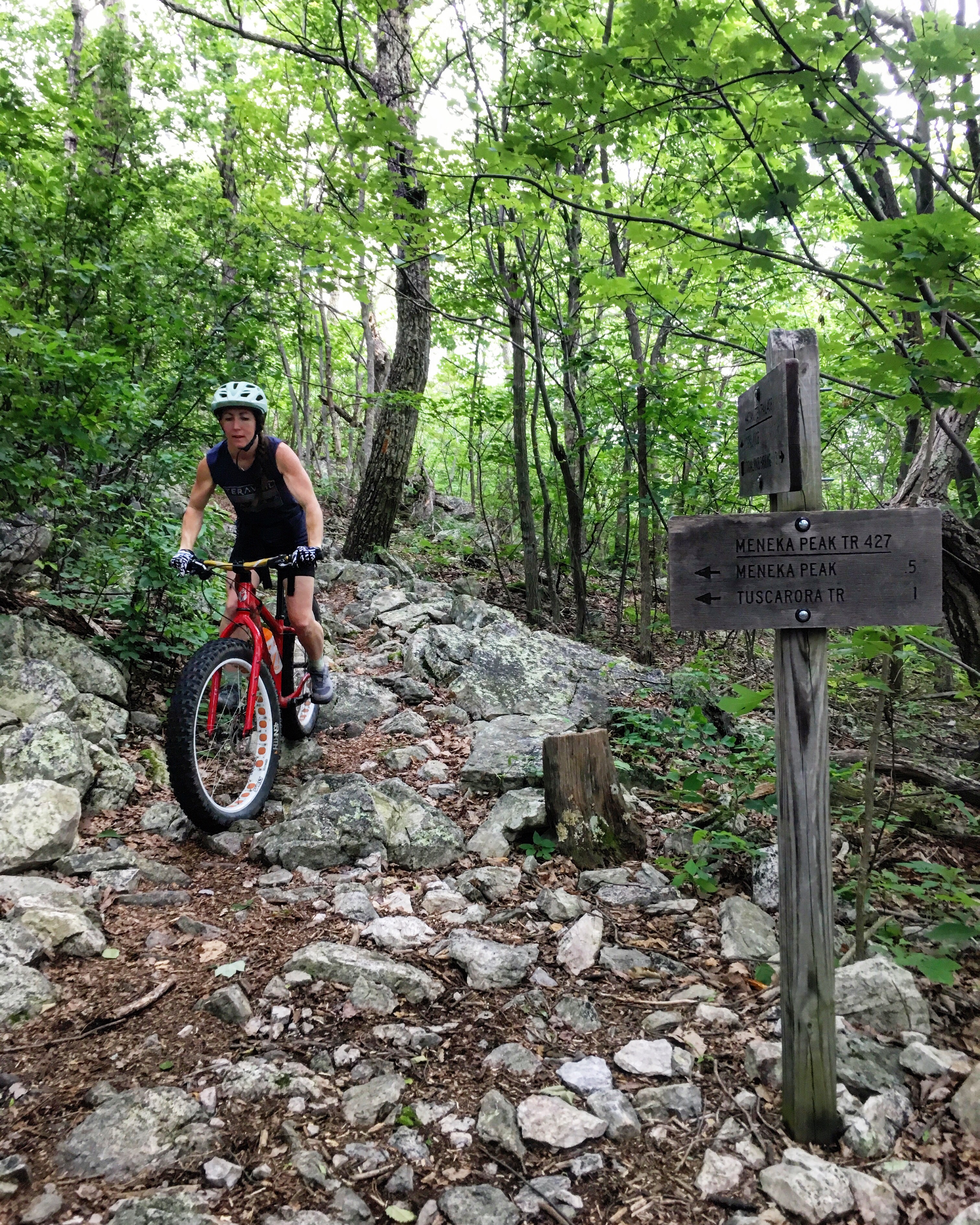 We were climbing Signal Knob Trail in the northern Massanutten region of Virginia. This section of trail is part of the 70-mile long Massanutten Trail, which creates a “Ring” following two ridges. The riding here is known to be highly technical. Doing a “Full Pull” of the Ring (the entire 70 miles in less than 24 hours) is something that rock-loving riders aspire to — and it’s not so easily done.