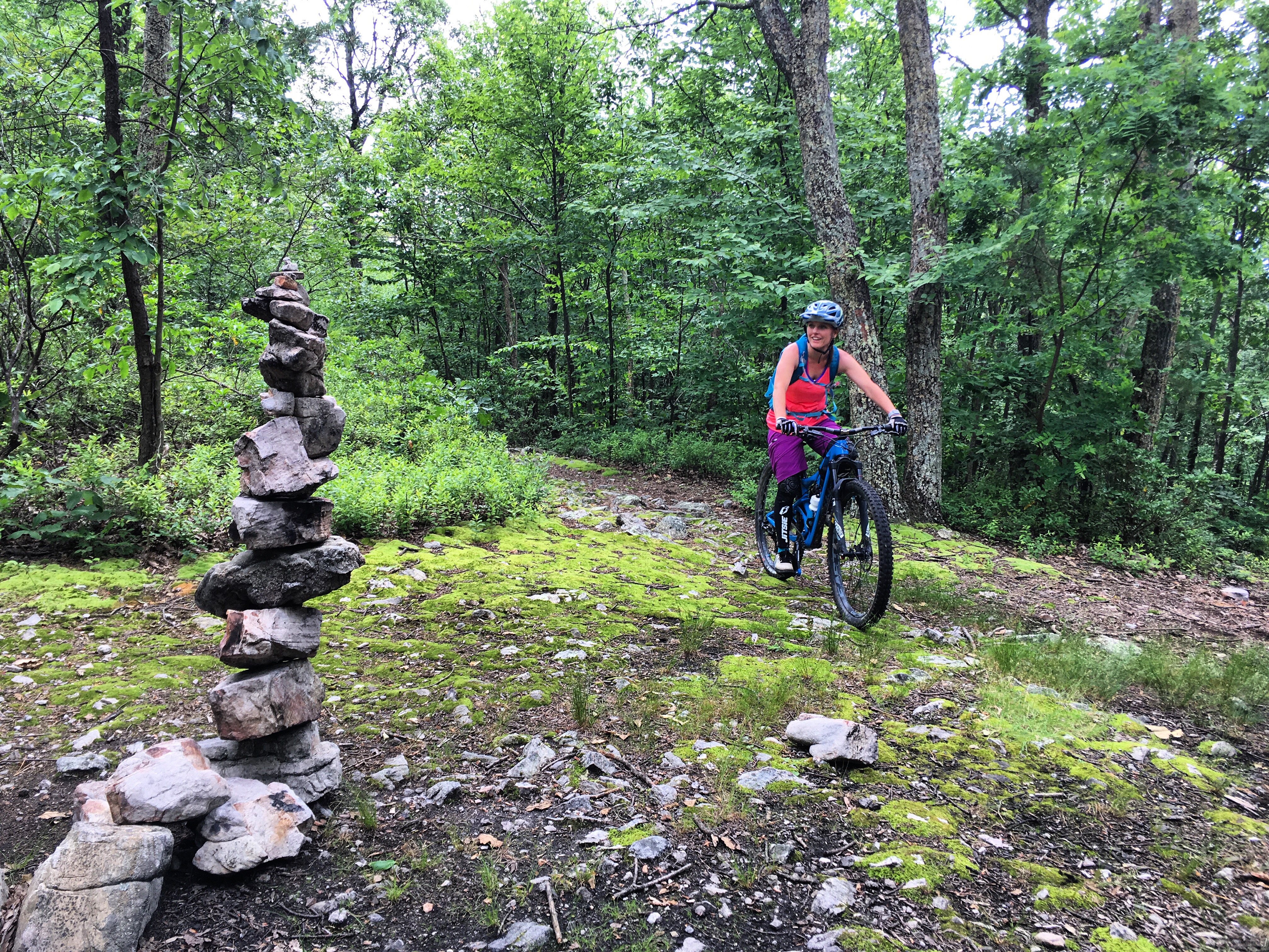 Shawl Gap was another fun descent, marked by several sets of stone stairs that looked intimidating but really weren’t that hard to ride down. Once again, it was rockiest towards the top of the ridge and mellowed out as we neared the stream at the bottom, popping out at the popular Elizabeth Furnace lot. We didn’t see any other mountain bikers, but there were plenty of hikers out and about, most of them with backpacks that suggested they were returning from overnights.