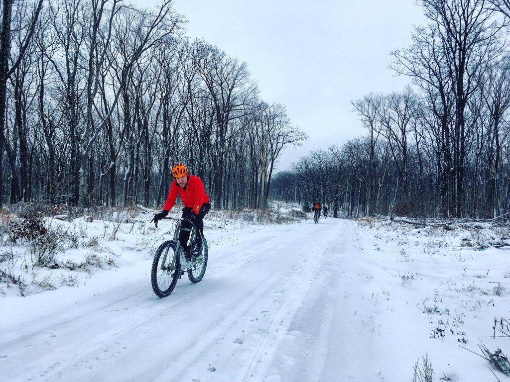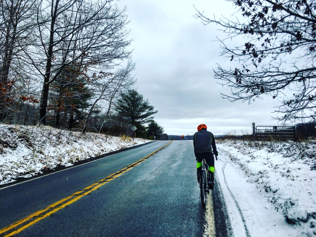 We had a brief respite on pavement and then we followed the route onto doubletrack snowmobile trail. This section was even tougher going. As the trail began to climb, I struggled to get traction in the snow that was a mixture of slush and icy crust. I was also getting very hungry. I hadn’t fueled myself enough pre-ride or early in the ride, and it was catching up with me, making me “hangry” and exacerbating my frustration with not being able to easily pedal. The next time I was stopped by the snow, I pulled out a snack. Behind me, Josh did the same. We exchanged a few words about the conditions and I assured him that it wasn’t just him doing something wrong. But food in my belly, I was feeling much better about the situation and forged ahead with a new spunk and better attitude.