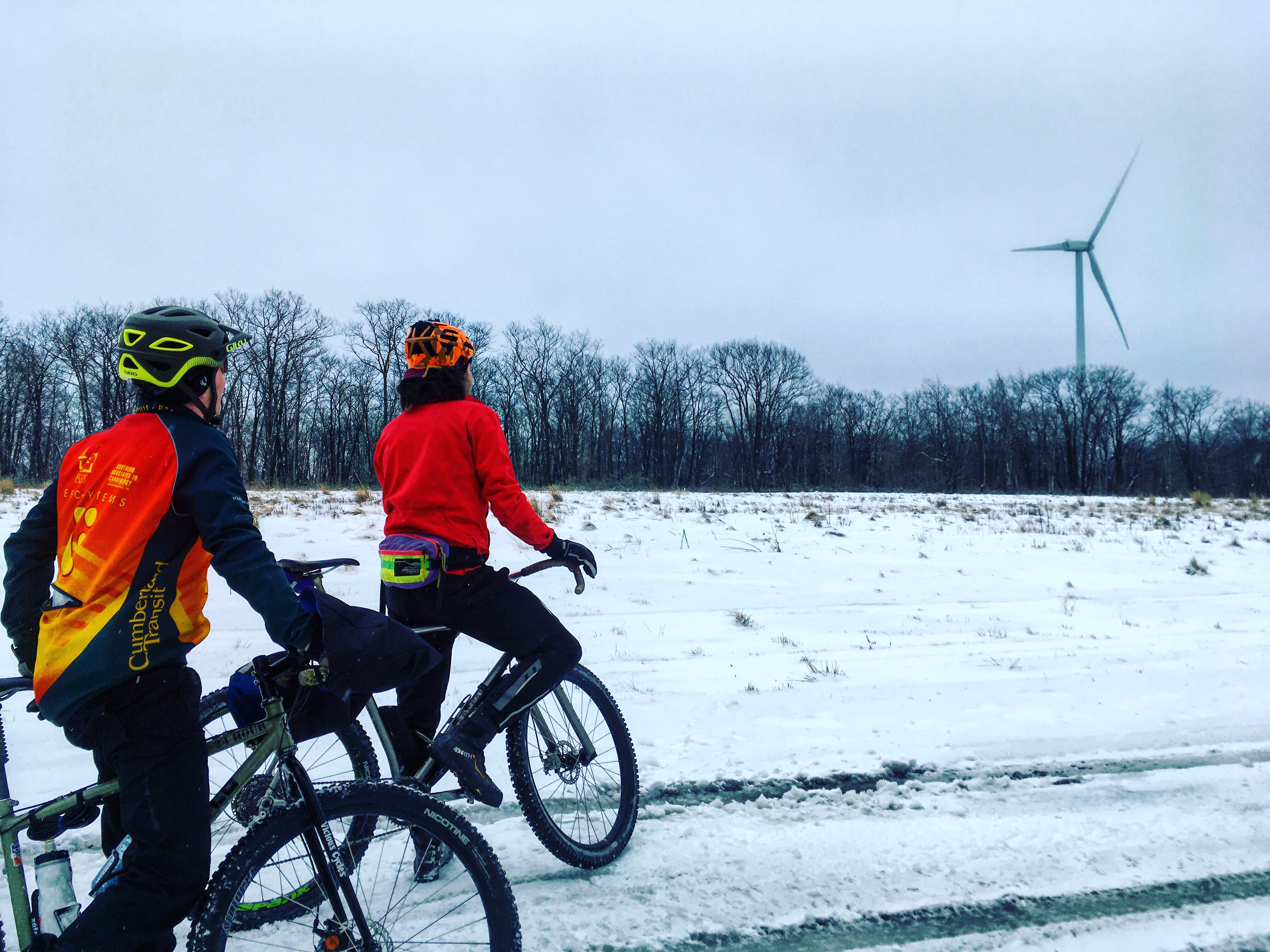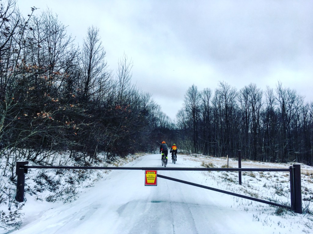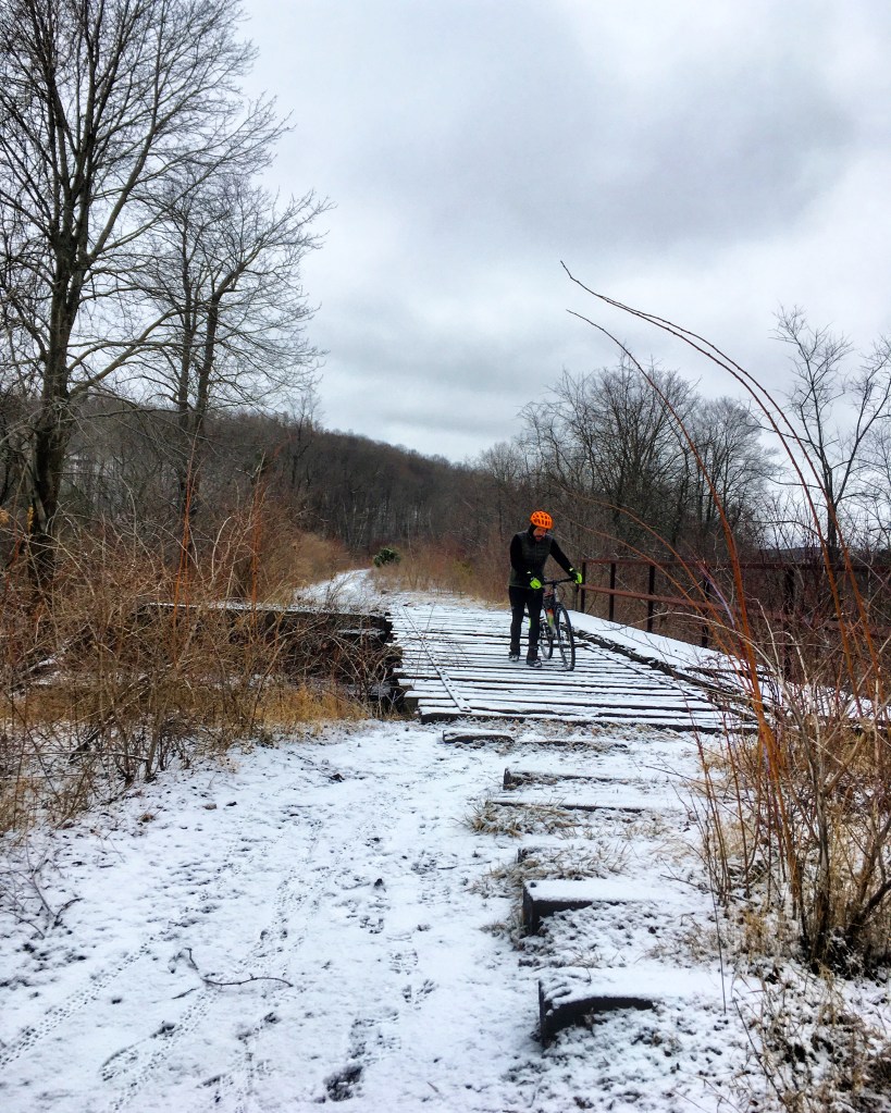 The town of Ramey brought us to the Houtzdale Line Trail, a rail-trail which we followed northward to the outskirts of Osceola Mills. On the southern end, the trail looked like it had seen plenty of use, including by a fatbike as evidenced from the tracks. It was fairly easy going despite being snow-covered. North of Houtzdale however, the trail deteriorated and became more rutted. It was wet, tiny rivers running on the trail itself, cutting through the coal dirt. I’d explored this trail back in the spring and experienced similar conditions, giant puddled stretching the width of the old rail bed. At the end, Josh remarked, that’s the most technical rail-trail I’ve ever been on.