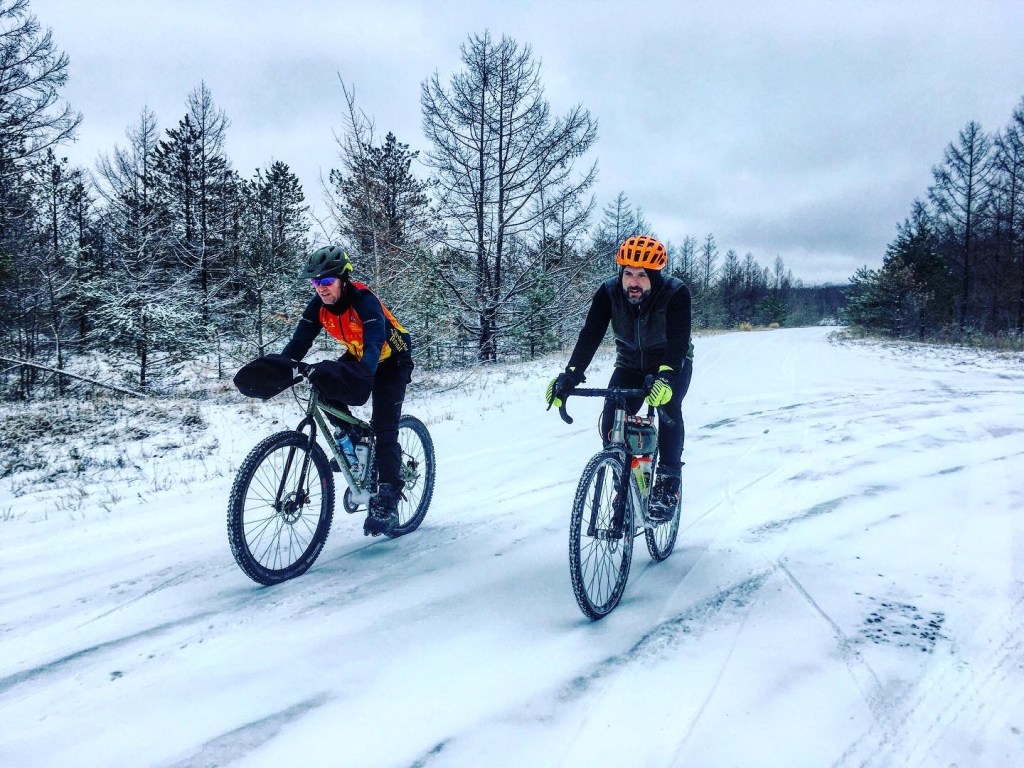 There was more snow than expected up on the plateau, and the dirt road was covered with a crust that made going a bit tough with skinny tires (38c studded 45NRTH Gravdals). Evan and Shannon were faring a bit better on 29 x 2.5 studded 45NRTH Nicotines, but still claimed that it was hard for them too.