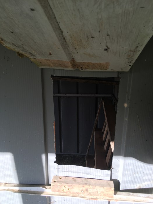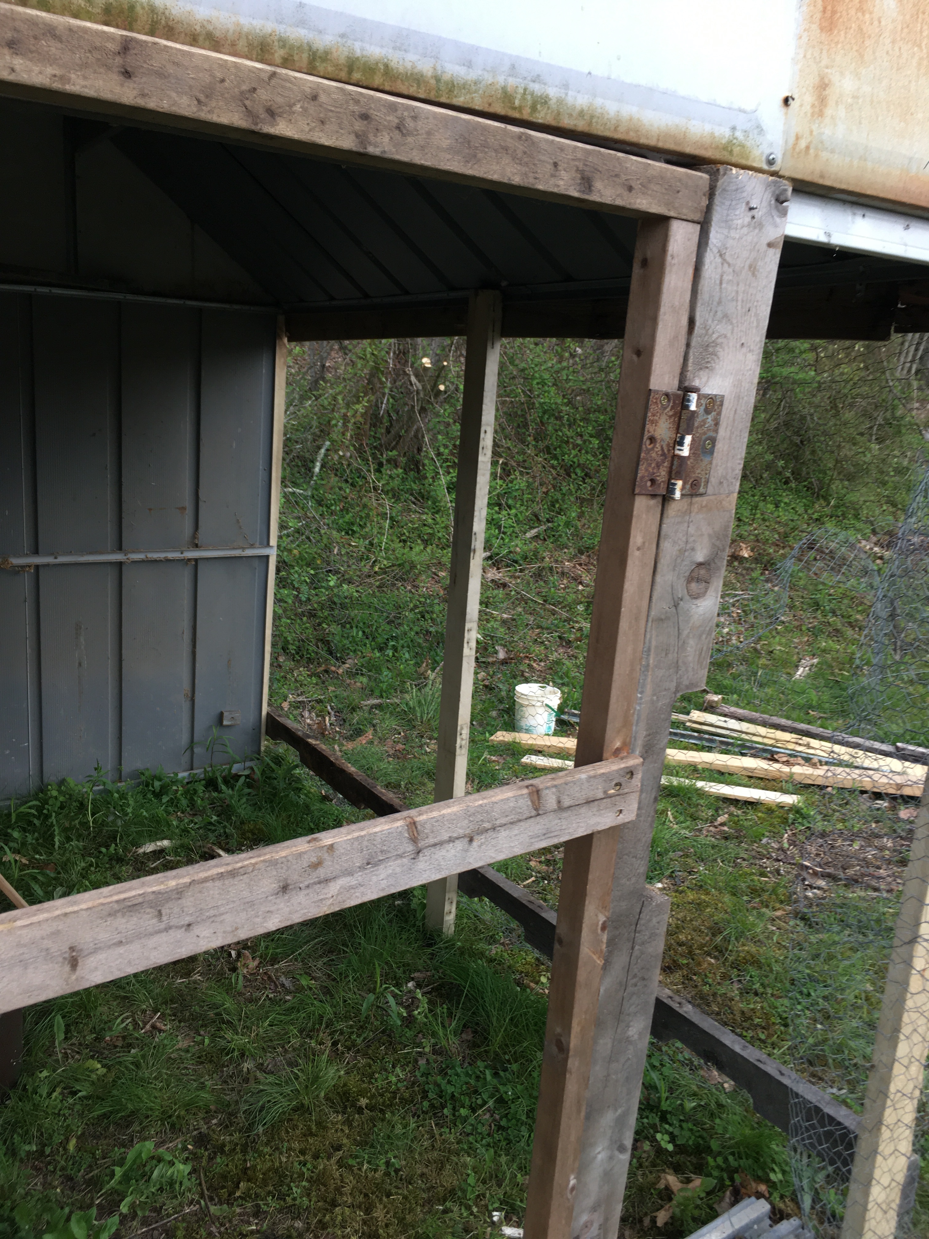 Since the wood also needed to act as a surface to which I could staple the chicken wire, I also had to add wood in areas where I didn’t actually need it for support, such as along the roof line. For these areas, I used pallet wood decking, as they didn’t need to be as sturdy. The roof line already featured a piece of metal with holes in it that originally held the metal siding, so I just screwed the wood to that.