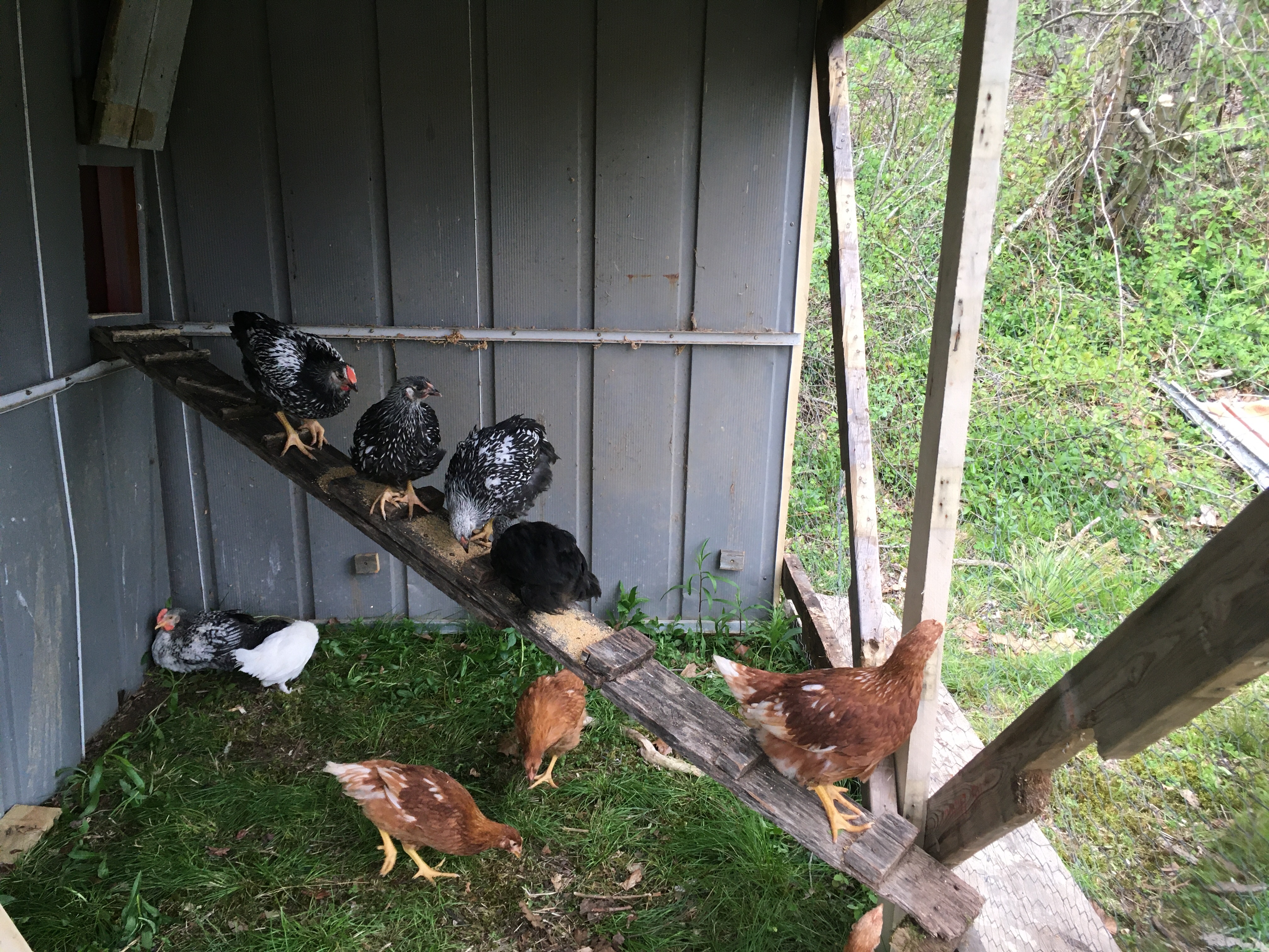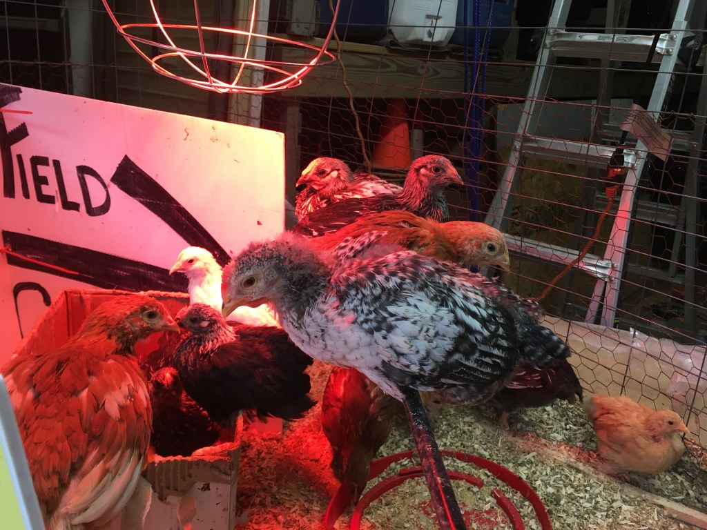 I added a few roosting perches and ramps for the chickens to go from one side of the coop to the other, and it was ready to go! I still needed to build nesting boxes and I wanted to make some more “chicken furniture,” and I also was waiting for some hardware cloth to arrive to secure the outside against predators better, but the coop was livable and that’s what mattered right now. Our 6-week-old chicks desperately needed a bigger home. Evan helped me move them, and they seem to be settling in nicely. There’s still work to be done, but for now, I’ll count my Covid coop as a success for this inept builder.