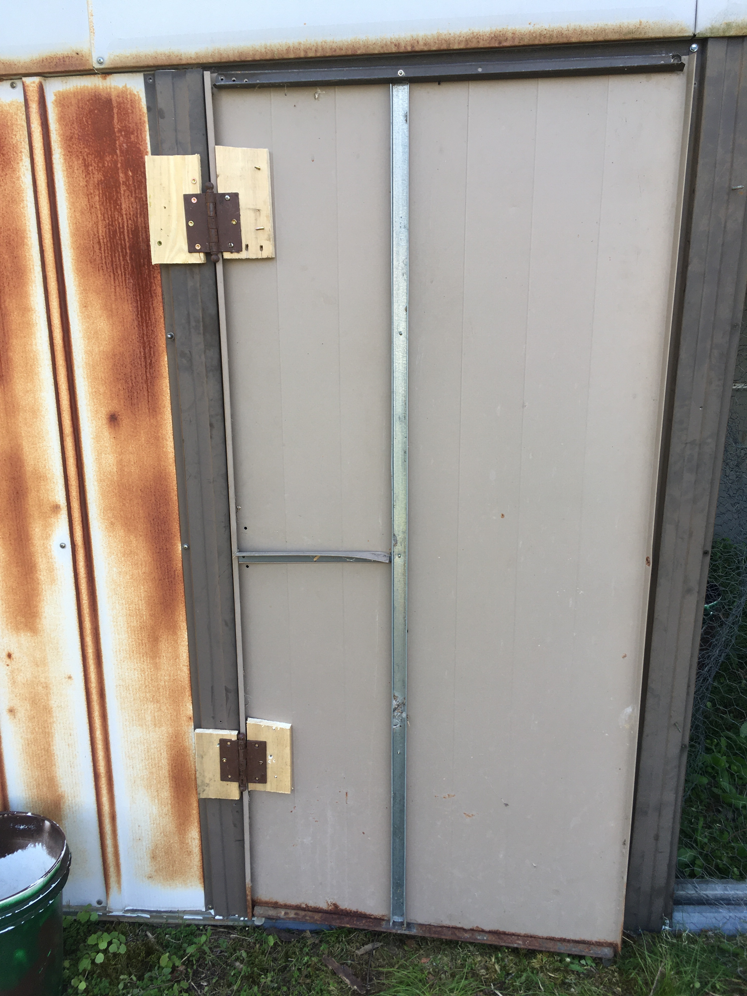 The metal doors that used to slide really didn’t work anymore, and had been removed from their slides and were nearly impossible to get back in. I needed to figure out either how to use the existing door in a new fashion or find or build a different door. Then I realized I’d need two doors, because we would need a way to get into the outer area of the coop as well in order to shut the door for the chickens if it was going to be cold or to do repairs/cleanup in that area of the coop. I didn’t want to deal with two rickety, crooked metal doors, and I really liked the idea of the entire “outside” half of the coop being nice and open. So I decided to build a door from scratch for that side, and use the old metal door for the “inside” side.