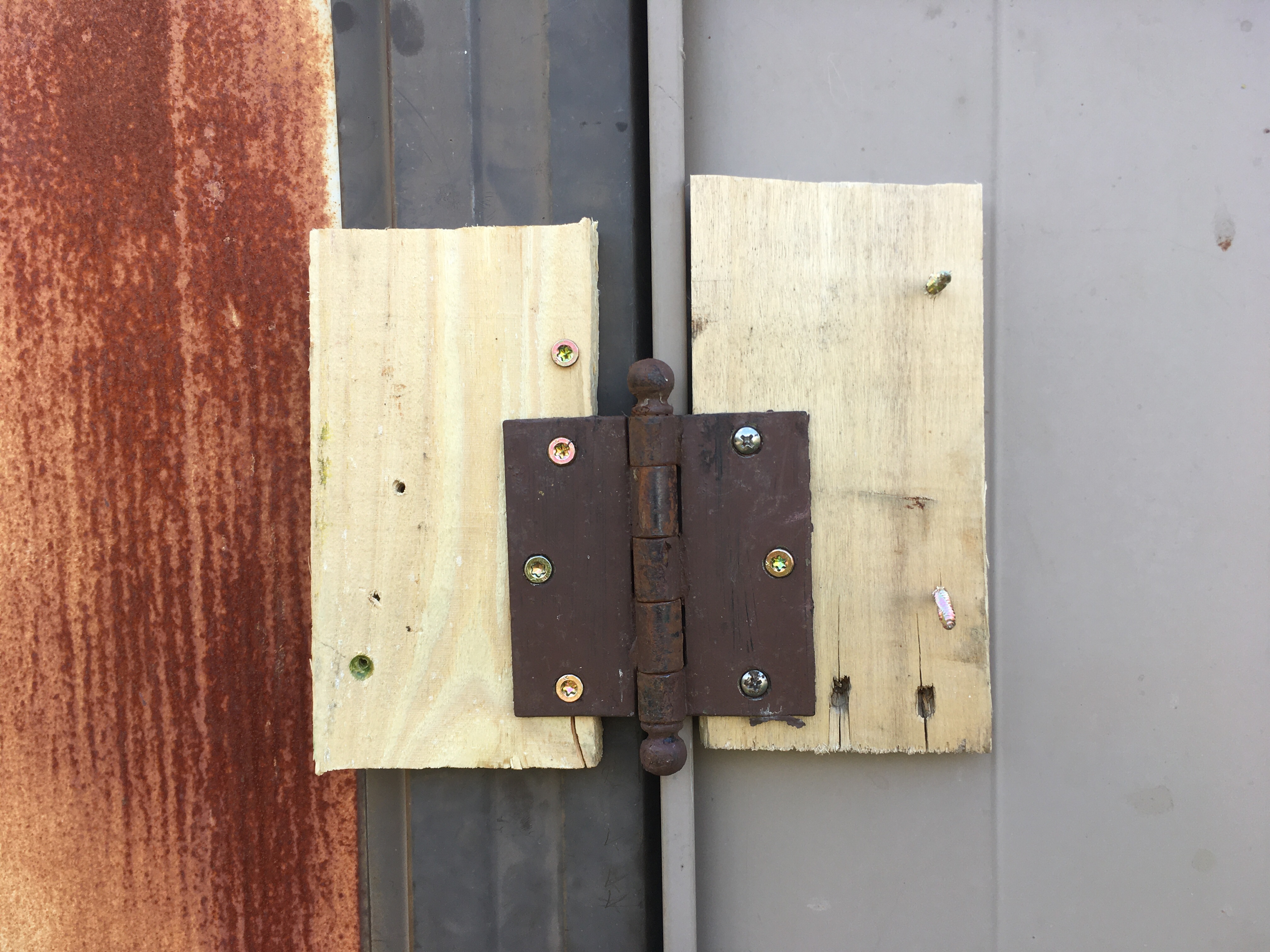 We had a big frame for a sign hanging around that was made of 1 1/2 inch square posts, which I deconstructed and chopped up to my desired size. That sounds so simple, but in reality, when I tried to fit the door into its location, I realized that the slight lean of the shed combined with a slight discrepancy in the lengths of each side of the door caused it to not sit flush. I made adjustments and tried again. Eventually I got it right, and mounted it with hinges harvested from an old, currently-unused gate.