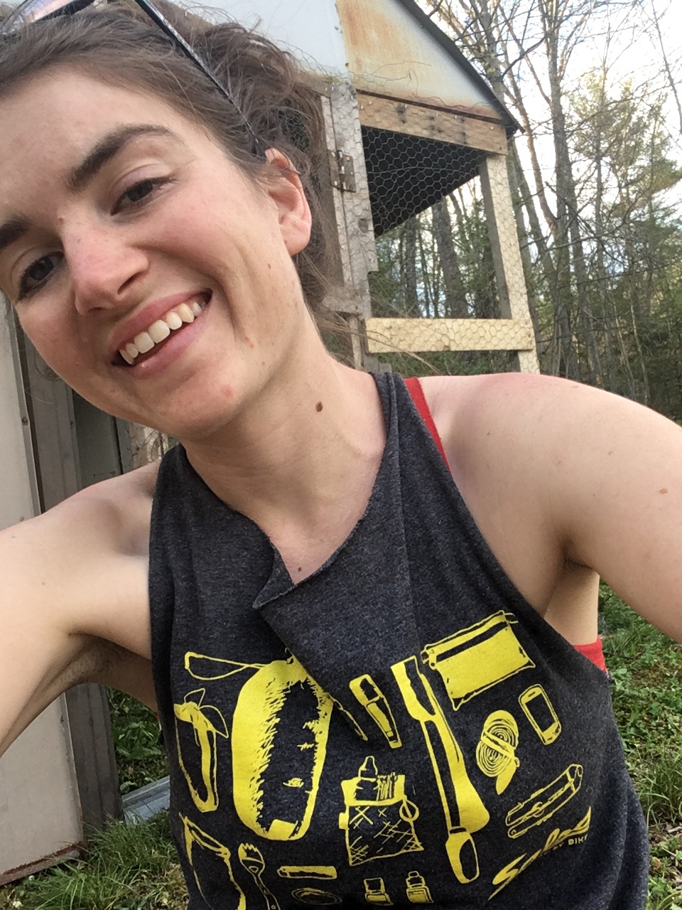 I had begun work on the coop on Friday afternoon, basically getting the supports for the outer section done and that’s it. On Saturday, I tacked up the chicken wire and fiddled with some roosts and perches on the inside. Sunday was my marathon day, consisting of getting the doors situated and finishing the chicken wire wrapping. I worked on it for 12 hours — yes, 12 hours! — and was totally in the zone and loving it. I didn’t even go ride my bike like I’d planned because I was on such a roll. I was actually having fun trying to problem-solve, something that often would stress me out in the past if I didn’t know how to do something. It felt good to be so immersed, and I felt empowered every time I came up with a solution to a problem that I encountered. But it was a ton of trial and error. I’d do something one way and then decide halfway through, or even after it was almost finished, that it would be better a different way. I’m not sure there’s a single piece of this structure that I didn’t have to unscrew and change around after I started building.