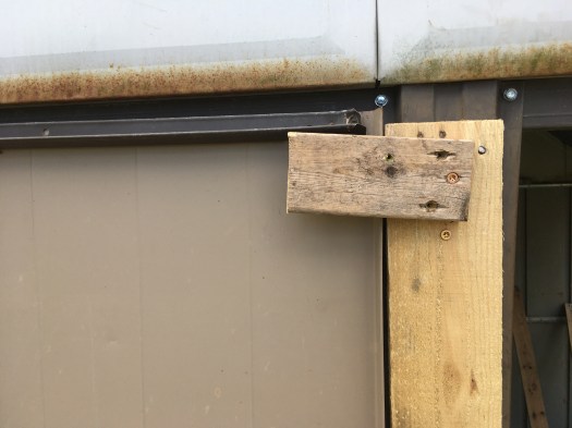 Aside from a few small sizing snafus, building the wooden door wasn’t that hard, but I wasn’t sure about how mounting the metal door would go. I was stuck on that problem for a day or two before finally figuring out a solution using wooden blocks to create a platform to mount the hinges so that they would be flush. I used a similar strategy to mount a latch on the other side of the door. Because the door and shed were a bit “cattywampus” (technical term), I needed to use two latches — one at the bottom and one at the top — to keep the door sealed shut so that no predators could get in. I figured the more secure closure needed to go at the bottom as that’s where animals like raccoons, fishers and foxes would potentially try to enter, so I used another harvested piece of hardware from a gate for the lower lock. The upper section of the door just needed something simple to keep it closed, so I made my own rustic latch out of a couple pieces of wood (full disclosure: I watched a YouTube video on “DIY latches” for the idea). I used the same technique to make a latch for the door on the outside section of the coop as well.