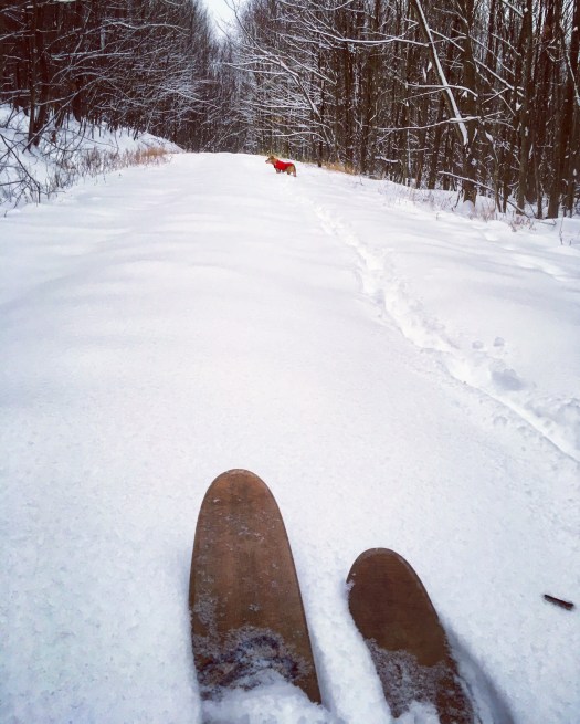 The next day, it was time to try out the Altai Hok skis. Evan and I each bought a set of these several winters ago, and have only had the chance to use them a handful of times because rarely do we have good snow conditions for them to shine. They are an extra versatile backcountry ski, with a partial climbing skin integrated into the base and a short, wide profile that makes them almost a cross between skis and snowshoes. I took them for a sunrise jaunt in our home woods before work and discovered a newfound love. The feeling of breaking through fresh, fluffy snow in the early light of dawn was incredible. Dinah hopped along in front of me, either unaware that walking behind me would save some effort or loving the powder too much to care.