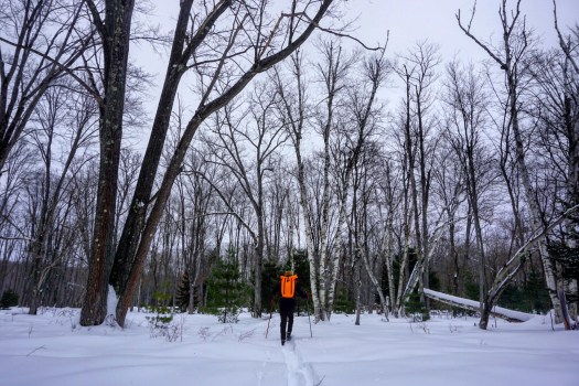 We wandered through the woods finding hollows and bowls, eyeing lines that are open and following them for miles on the vast swaths of public land in central PA. We found that trails actually gave us some of the worst ski conditions — they tended to be sunken in and narrow, causing the outsides of our wide skis and boots to scrape the sides of the trench. So we often used trails as a reference point, keeping them in sight but choosing to instead find our own paralleling paths through the woods.
