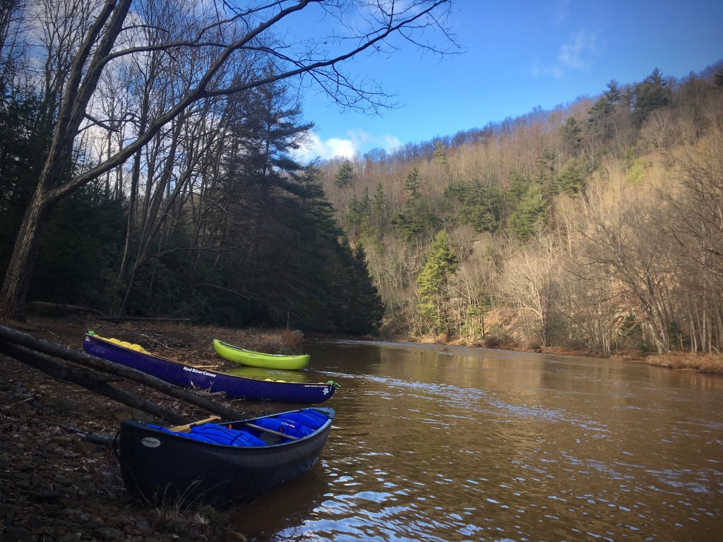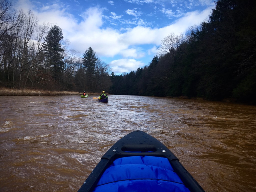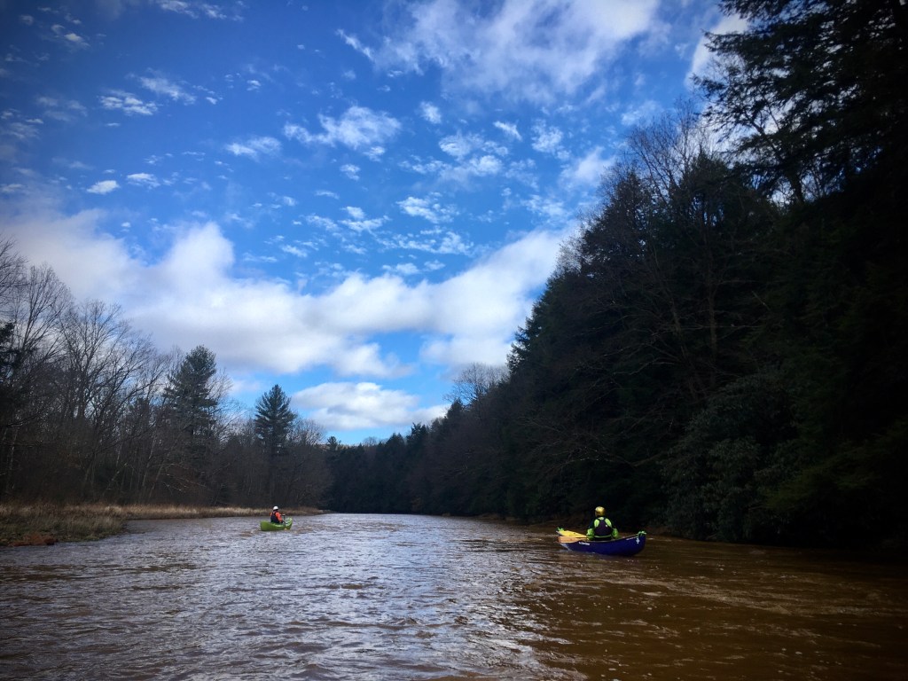 Until yesterday. The forecast said it might hit 35 degrees, with a “real feel” in the high 20s. It was breezy, but it was also supposed to be fairly sunny. Evan and our friend Justin (aka JWag) were going to paddle the Red Mo (Moshannon Creek). Instead of taking out at the traditional spot at the Rt. 53 bridge, they wanted to continue all the way to the mouth at the West Branch of the Susquehanna. Evan said it would be a 15-mile paddle. I knew I wasn’t mentally ready for my first foray back into cold weather paddling to be something quite so long. That could take up to 5 hours, depending on how fast the river was running. But I could drop my car halfway and just do the upper portion for a 7-mile run. I thought about it for a couple hours. My instinct — or perhaps more accurately, my habit — was to not go. It would be too cold. But that’s also precisely why something in me was pushing me to do it. I am so darn sick of my comfort zone. And I haven’t paddled the Red Mo since maybe 2014 or 2015, when Evan and I participated in the downriver race in a tandem canoe. In fact, I’ve only done this stretch of river during the race, which, I’d find out, is a totally different experience than just casually paddling it.