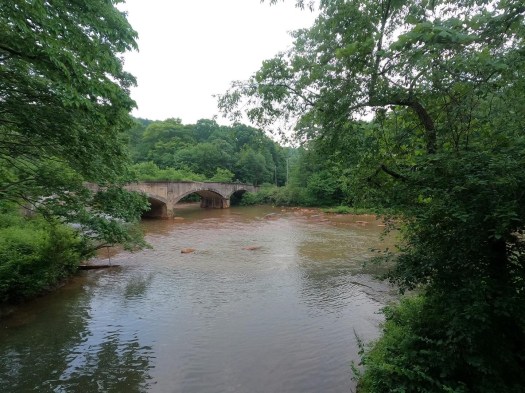 The Conemaugh Dam was built in 1952 as a flood control facility, and as a result, sometimes the bridges that carry the West Penn Trail over the river are completely underwater in an effort to prevent swelling the Conemaugh downstream of the dam and inundating the nearby communities. This has caused the four historic stone bridges to be littered with debris from the floods, and it also means you aren’t sure if the trail will be passable until you climb up over Bow Ridge if you’re coming from the western end. It had been pretty dry leading up to this ride, so I was feeling confident that we’d be able to get through. Sure enough, as we carried our bikes down the stairs, I saw the dry causeway stretching across the water — we were good to go. Luckily, the first bridge is the closest to the water and thus a good indicator.