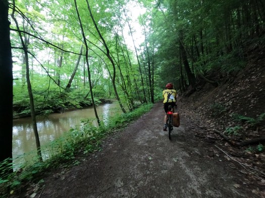My back was also starting to hurt. The bike had been more comfortable than I’d expected for more of the ride (see my previous post on choosing to ride my commuter), but at 6-7 hours in, I was beginning to feel the more hunched-over position than I am used to on most of my rides of this length. I alternated sitting and standing, trying to stretch out as I rode, and made every effort to resist looking at my watch every 2 minutes to check the mileage. It was a gorgeous section of trail, paralleling Blacklick Creek in a wooded valley, but mentally, I was struggling to focus on that and not my body parts that were starting to ache or the fact that I was hungry yet again.