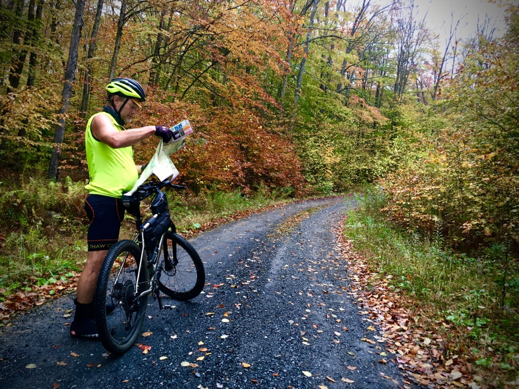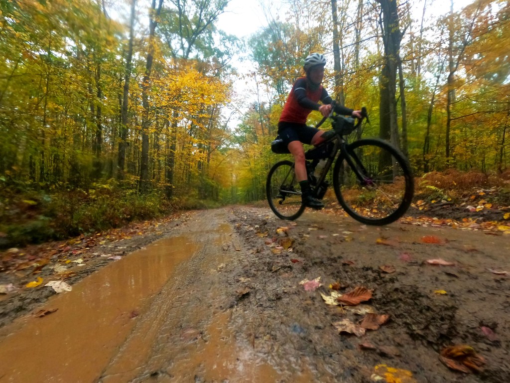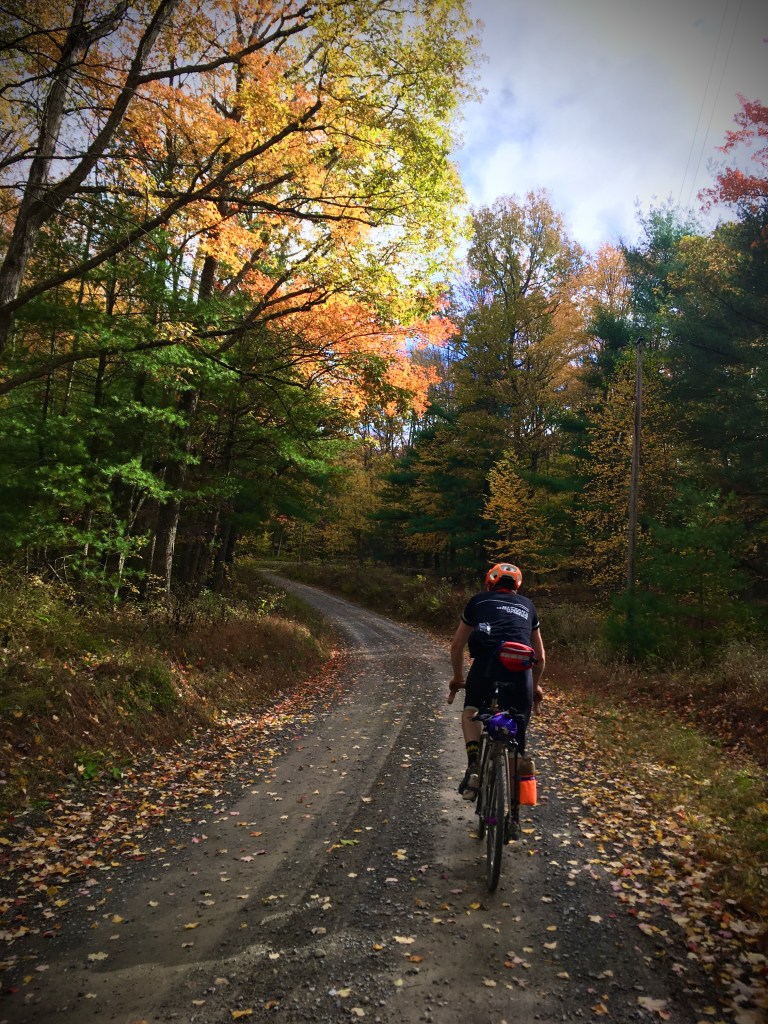 The rain started again just a couple miles into the ride as we were climbing Hyner Run Road. We stopped to don rain gear. The colors of the leaves were so unbelievably vibrant, the gray and rain accentuating the yellows, reds and oranges contrasting with the dark gray of the gravel road. Rain or not, this was going to be a great day and a beautiful ride.