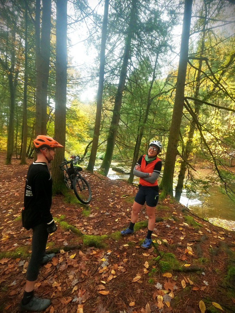 It was mid-October, and we were originally were supposed to go to Big Bear Lake Trail Center in West Virginia and camp and mountain bike for a couple days with a few friends, but the rainy forecast looked even worse there, and camping in 40s and rain wasn’t exciting anyone. So we came up with a new plan and made it happen in a hurry — a “cushy” (on paper ) overnight — riding to Wellsboro to stay in a hotel, then riding back the next day. It would also be Shannon’s first bike overnight.