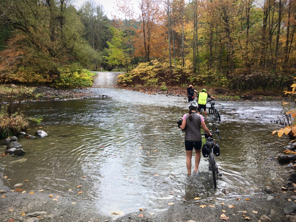 We all took our shoes off, not wanting wet shoes for the rest of the day, and waded across. The water was almost up to my knees in spots — definitely too deep to ride across, at least for me. The current was swift and I felt like I would have gotten swept downstream. The cold water cascading over my feet was actually pleasant despite the chill in the air, though ten degrees colder might have been a different story.